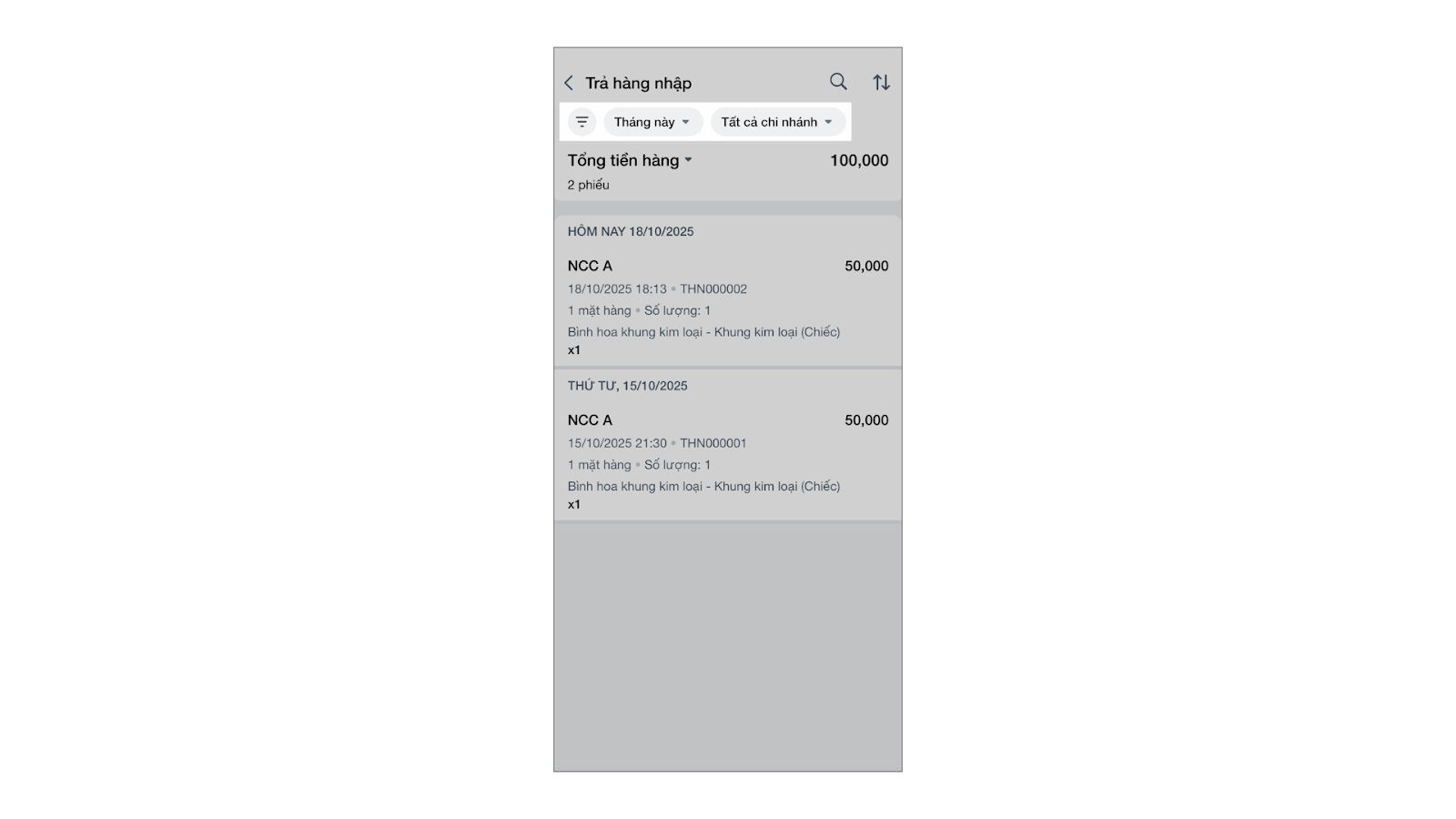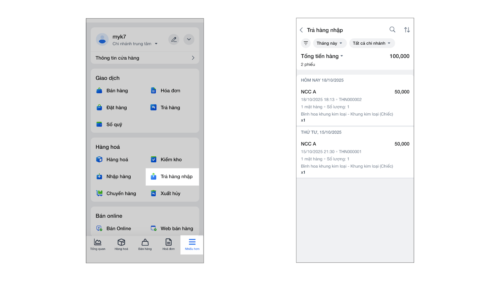 - Xem danh sách: Vào menu Nhiều hơn → Trả hàng nhập để xem tất cả các phiếu đã tạo.