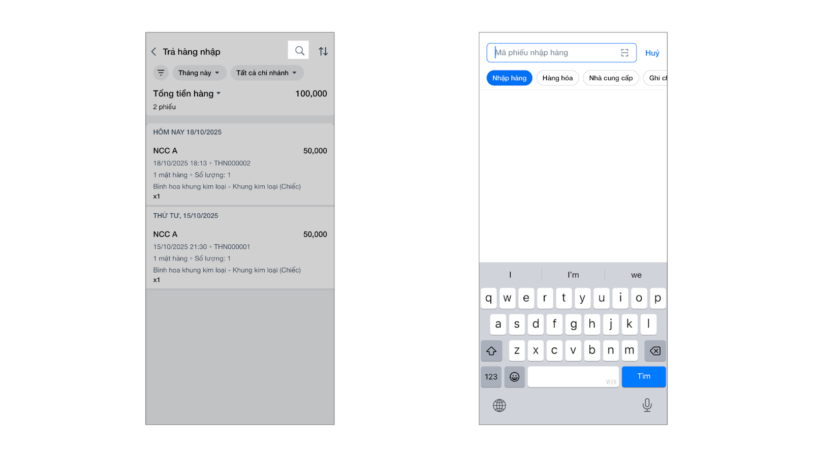 - Tìm kiếm: Chạm vào biểu tượng kính lúp, nhập từ khóa (mã phiếu, hàng hóa, nhà cung cấp, ghi chú) và chọn tiêu chí tìm kiếm.
