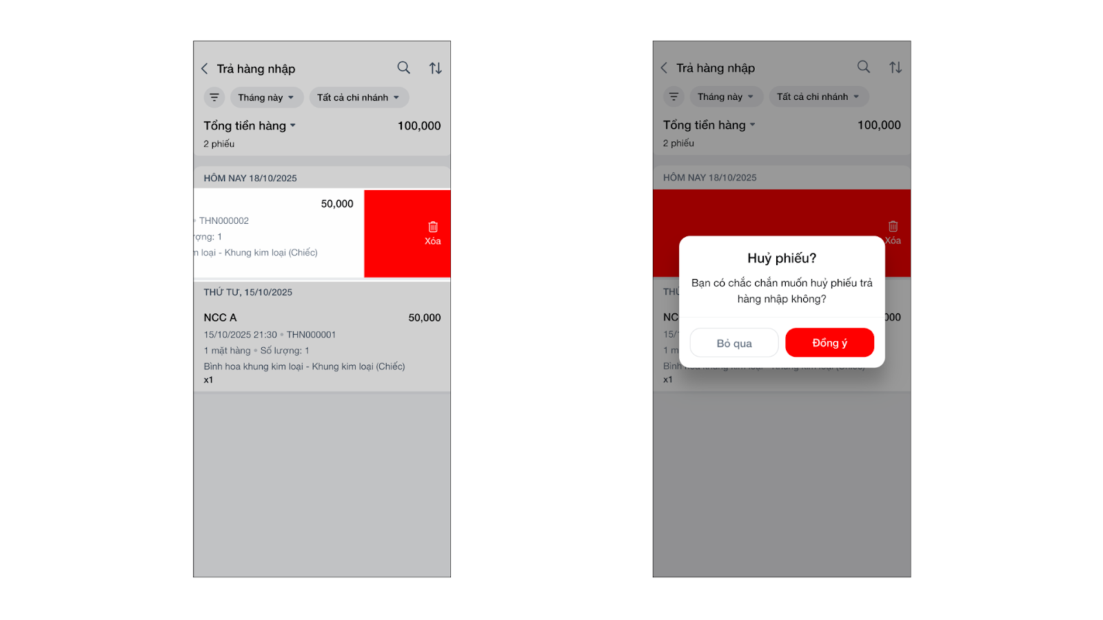 - Cách 1 (Từ danh sách): Tại màn hình danh sách, vuốt phiếu nhập cần hủy sang trái và chọn Hủy → xác nhận Đồng ý để hoàn tất việc hủy.