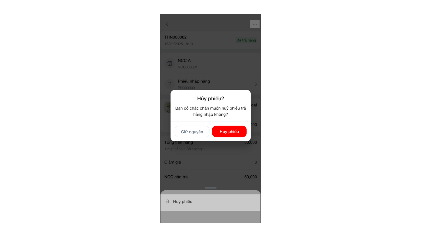 - Cách 2 (Từ chi tiết): Mở chi tiết phiếu trả hàng nhập, chạm vào biểu tượng 3 chấm ở góc trên và chọn Hủy phiếu → xác nhận Đồng ý để hoàn tất việc hủy.