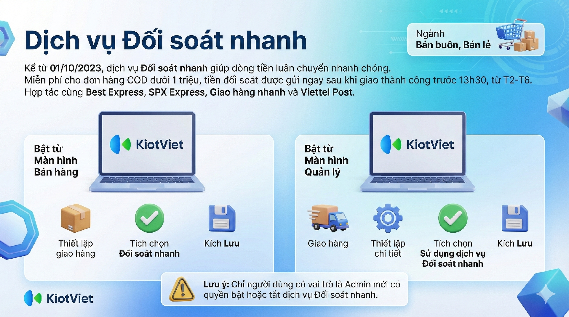Nhằm nâng cao chất lượng dịch vụ, với mục đích giúp cho dòng tiền hàng hóa được luân chuyển liên tục và nhanh chóng nhất, kể từ ngày 1/10/2023, KiotViet cùng các đối tác vận chuyển Best Express, SPX Express, Giao hàng nhanh và Viettel Post đã cho ra mắt dịch vụ Đối soát nhanh. Dịch vụ này hoàn toàn miễn phí cho các đơn hàng có COD dưới 1 triệu, tiền đối soát sẽ được gửi tới Khách hàng nhanh chóng, chính xác ngay sau khi đơn hàng giao thành công trước 13h30, liên tục từ thứ 2 tới thứ 6.