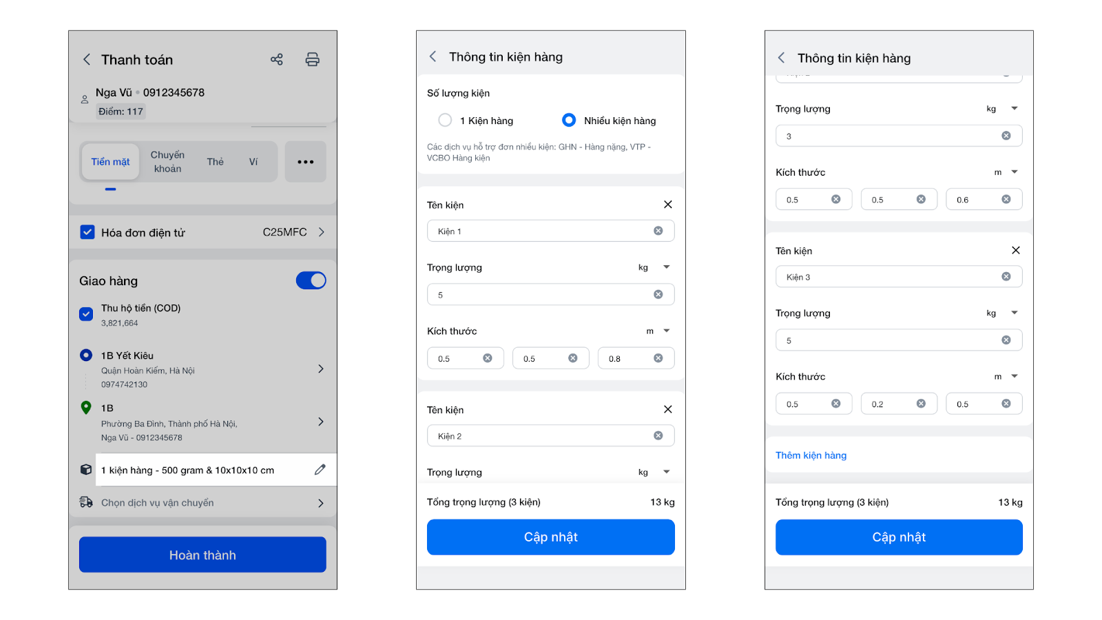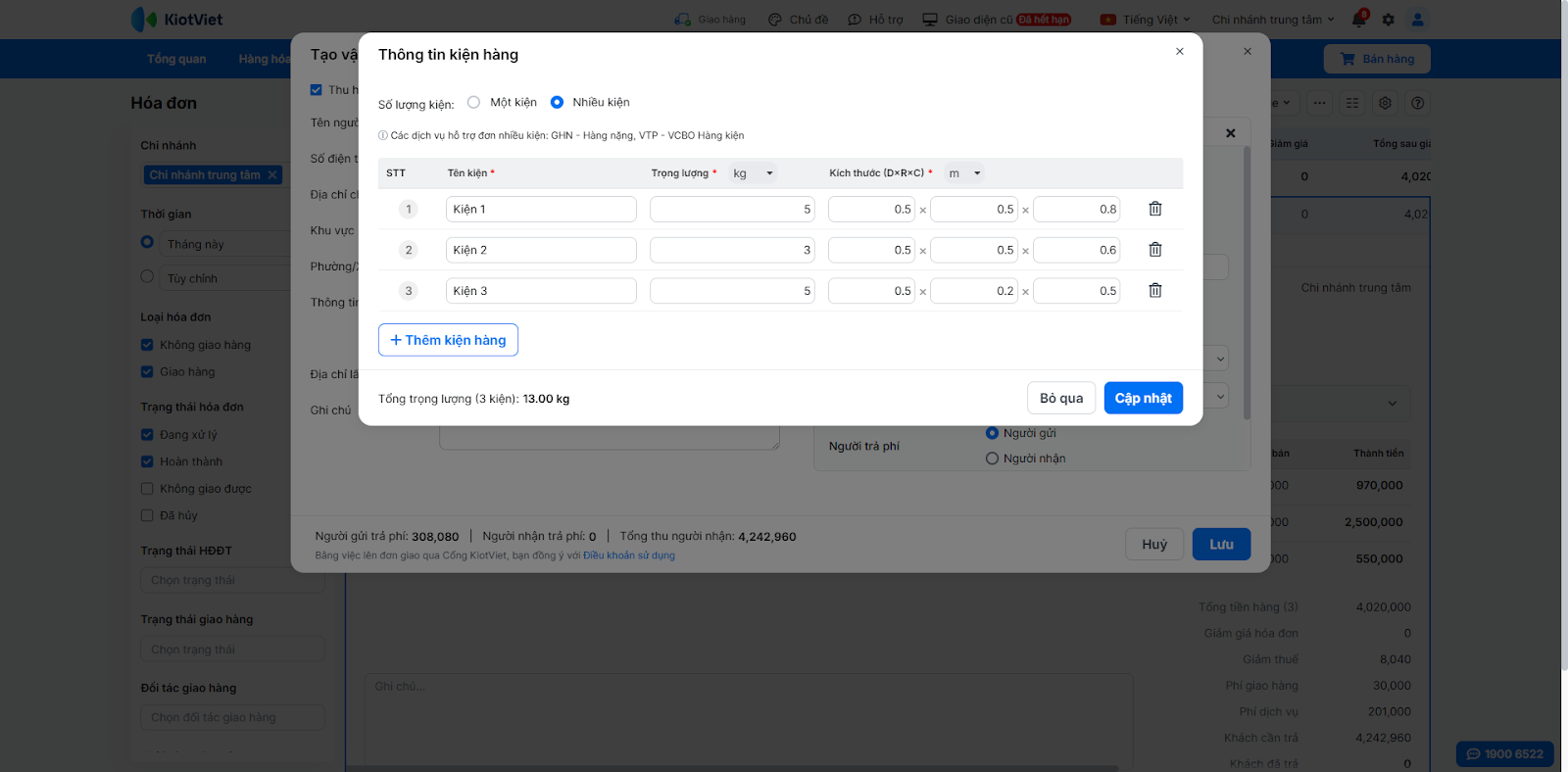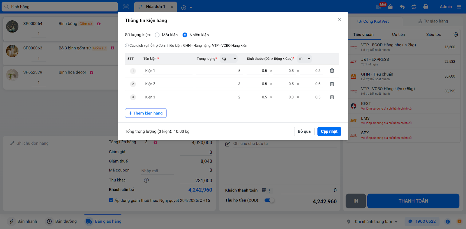 xóa nếu bạn muốn bỏ bớt kiện). - Nhấn Cập nhật → hệ thống sẽ tự động tính tổng trọng lượng (Ví dụ: “3 kiện – 10.00 kg”).