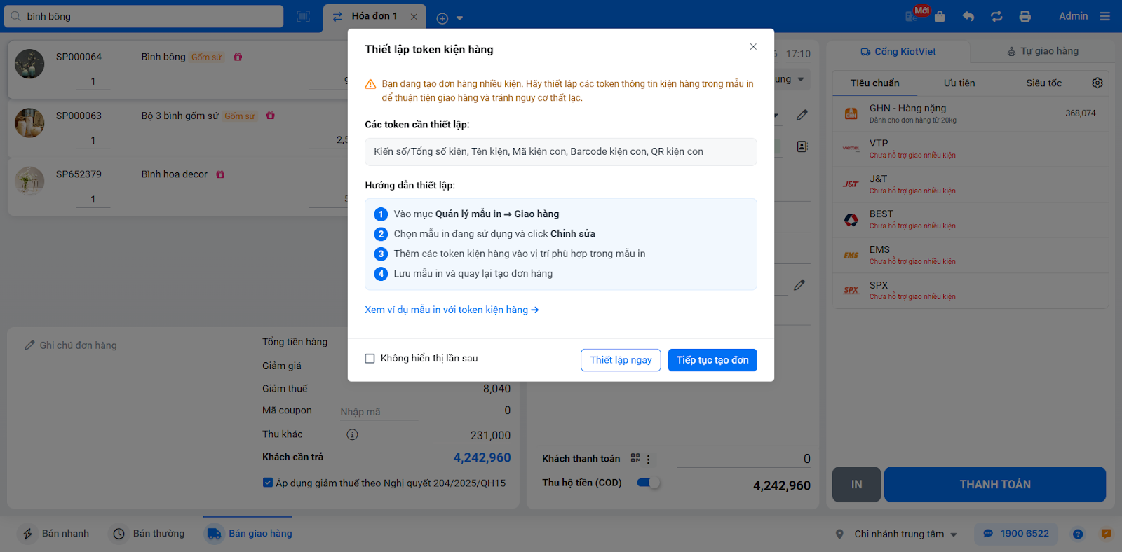- Với 3 đơn hàng nhiều kiện đầu tiên, hệ thống sẽ tự động hiển thị thêm popup Thiết lập token kiện hàng hướng dẫn thiết lập kèm ví dụ minh họa để bạn chỉnh sửa mẫu in. Bạn nhấn Tiếp tục tạo đơn để chuyển sang bước tiếp theo.