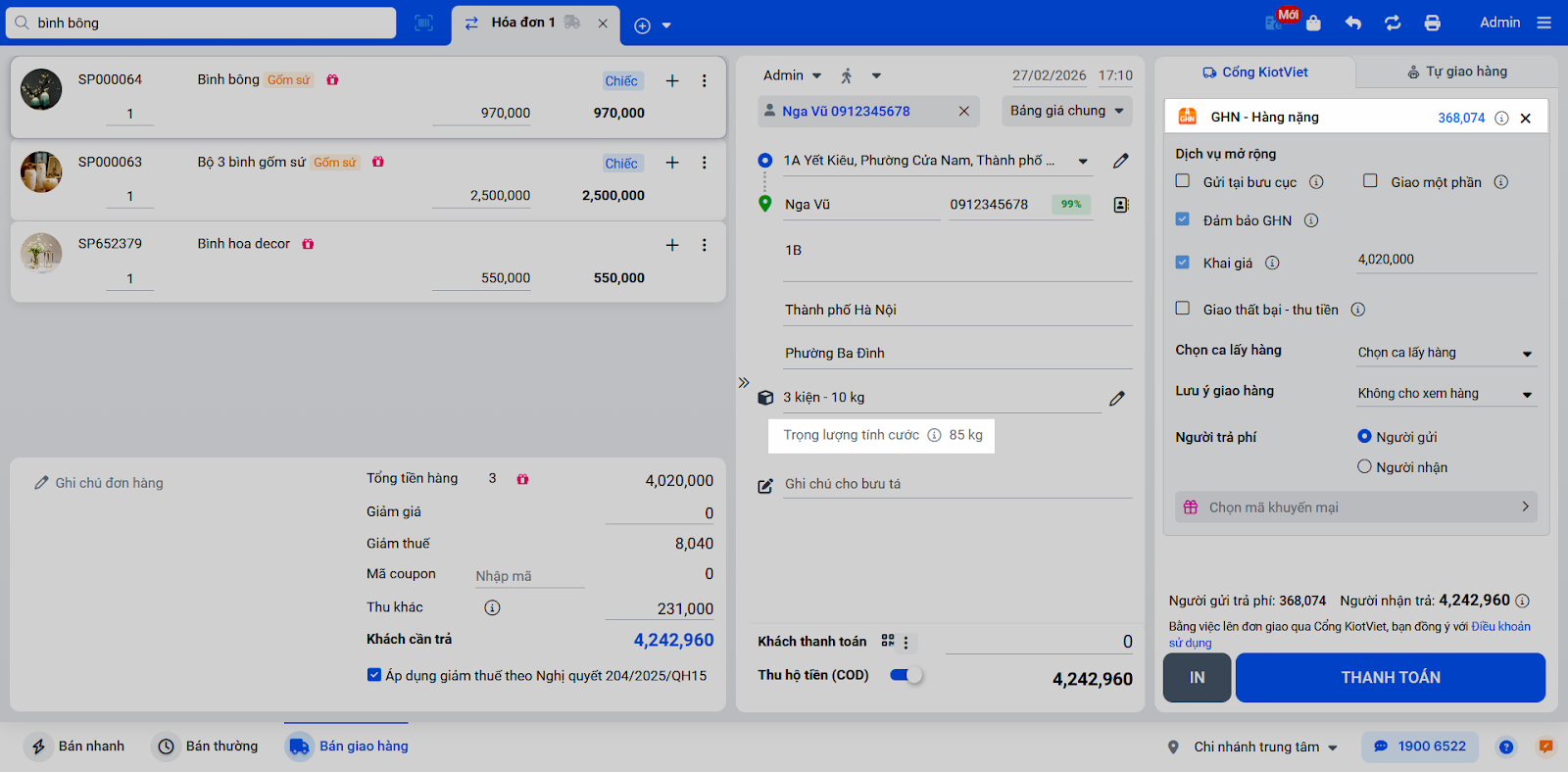 - Chọn dịch vụ vận chuyển (GHN – Hàng nặng) → ứng dụng hiển thị thêm dòng Trọng lượng tính cước.