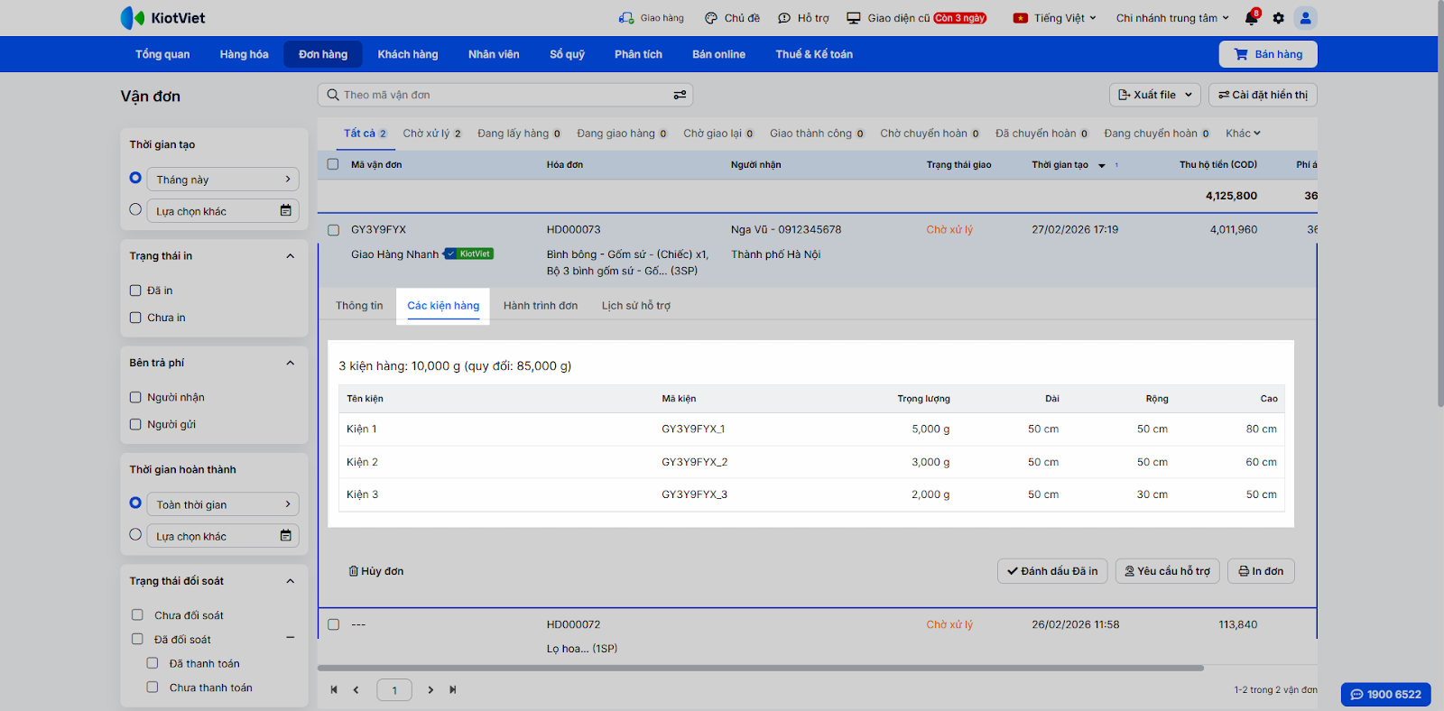 - Tình huống: Bạn cần kiểm tra lại mã kiện con hoặc kích thước của từng thùng hàng sau khi đã lên đơn thành công trên máy tính.