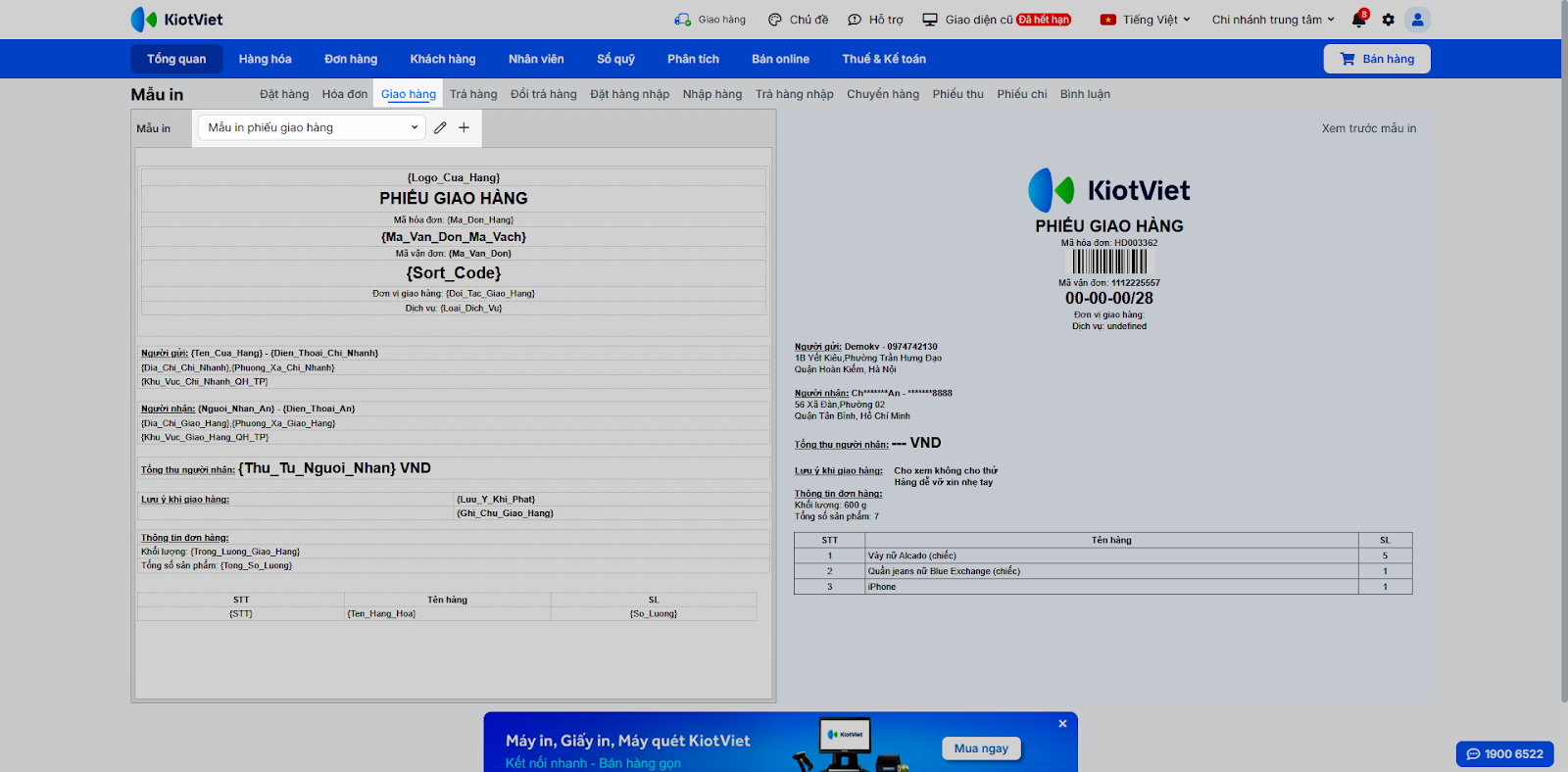 - Chọn Giao hàng → chọn mẫu in đang sử dụng để chỉnh sửa hoặc thêm mới.