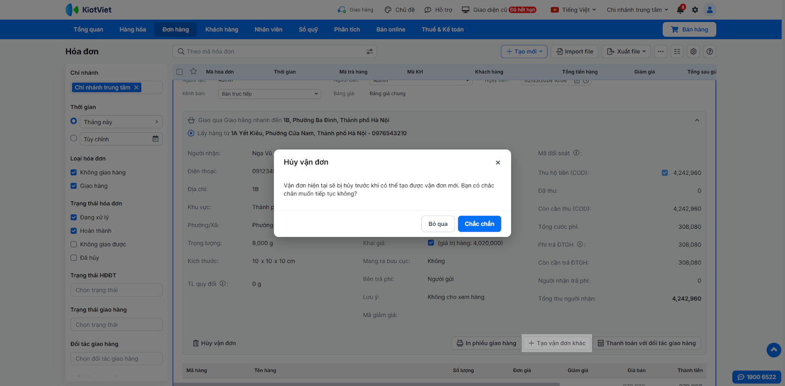 - Nhấn + Tạo vận đơn khác, hệ thống sẽ tự động hủy vận đơn hiện tại (nếu có) trước khi tạo vận đơn mới.