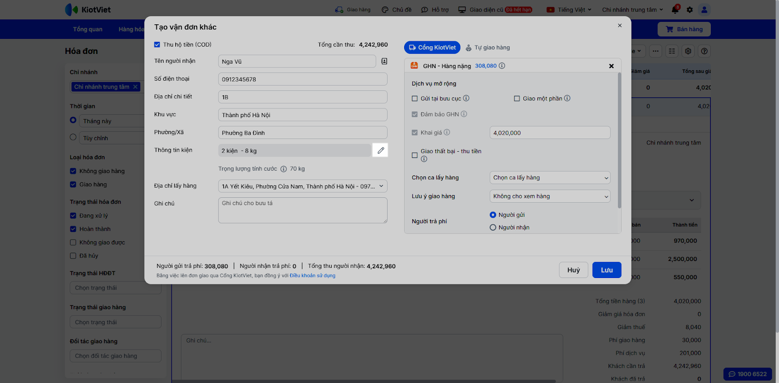 - Dịch vụ vận chuyển hỗ trợ: Hiện tại tính năng này chỉ áp dụng cho dịch vụ GHN – Hàng nặng. Các hãng vận chuyển khác hiện chỉ hỗ trợ tạo đơn giao 1 kiện.