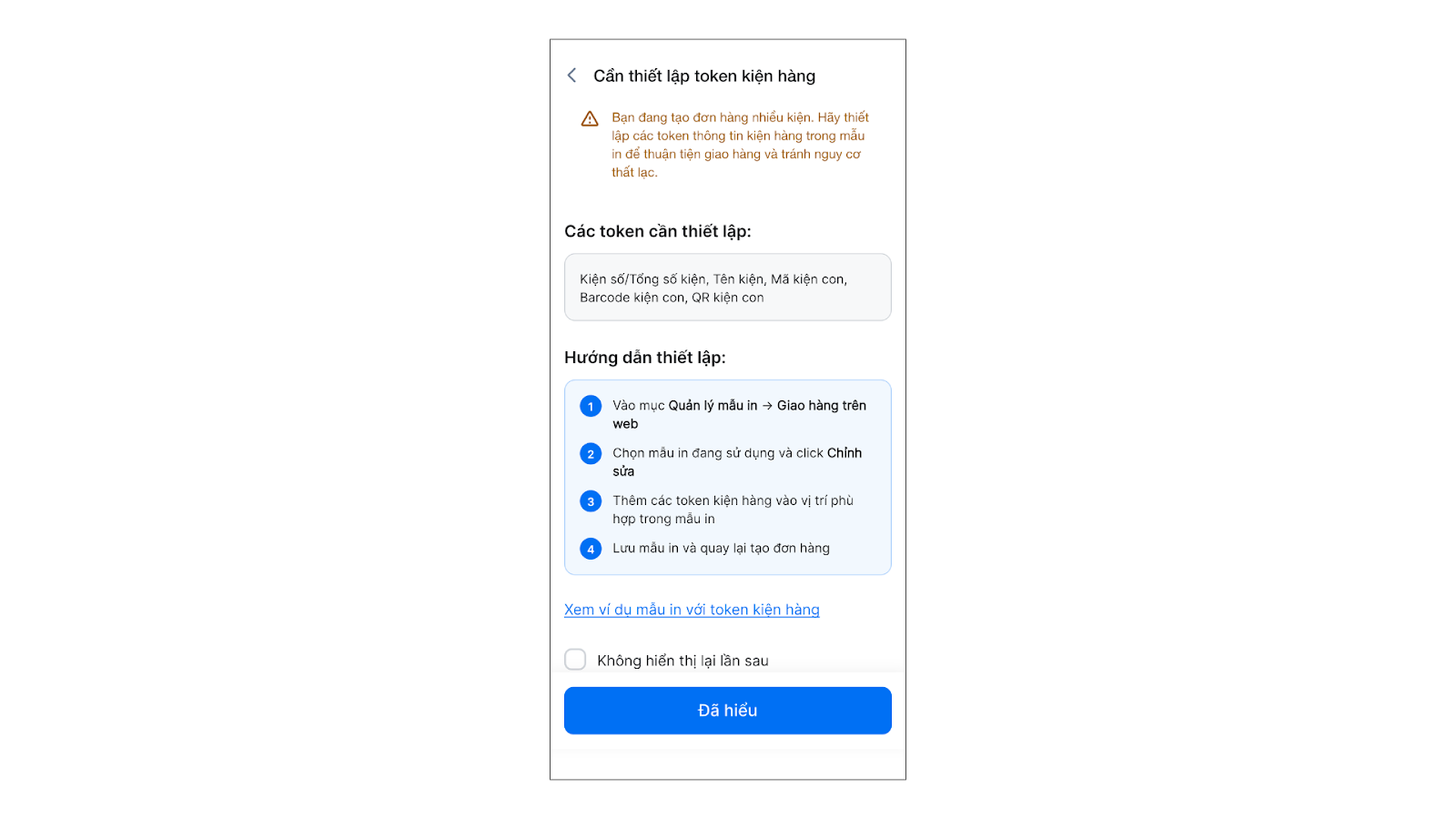 - Với 3 đơn hàng nhiều kiện đầu tiên, tương tự website, ứng dụng tự động hiển thị thêm popup Thiết lập token kiện hàng hướng dẫn thiết lập kèm ví dụ minh họa để bạn chỉnh sửa mẫu in. Bạn nhấn Đã hiểu.