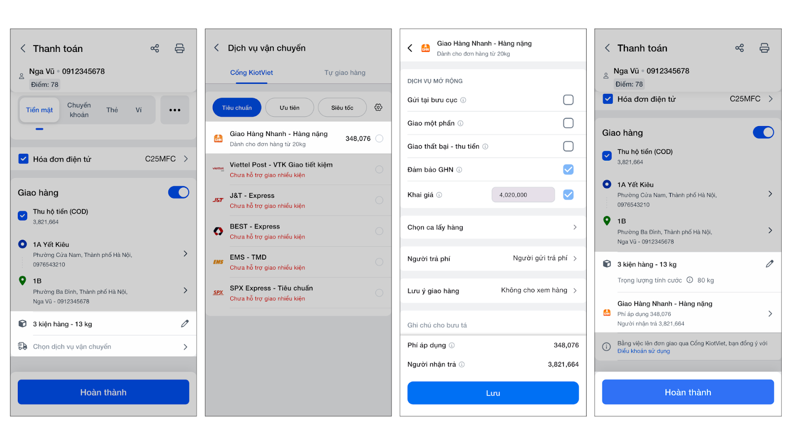 - Ứng dụng KiotViet: Màn hình Thanh toán hóa đơn, Đổi trả hàng, Xử lý đơn đặt hàng.