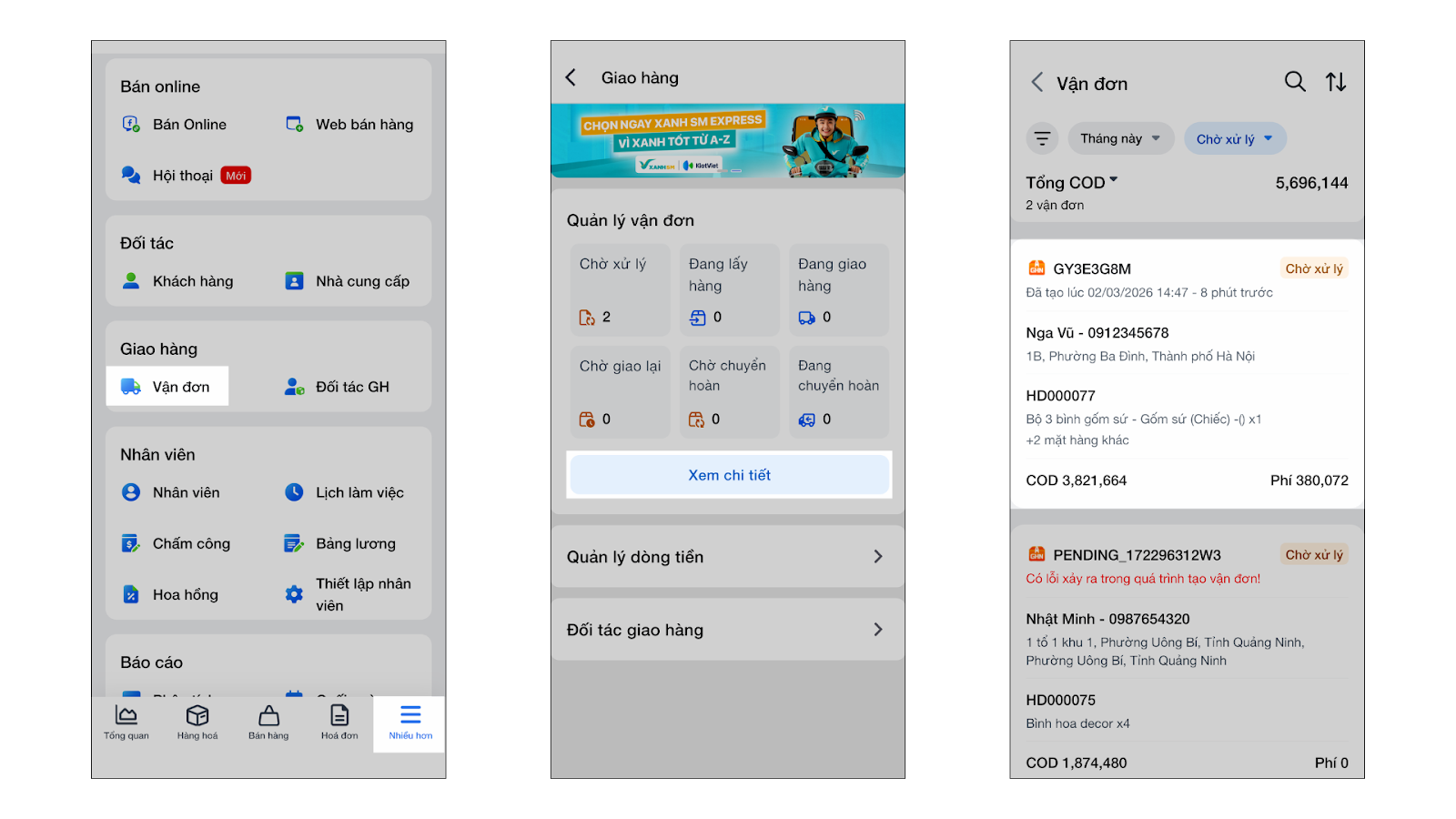 - Vào màn hình Giao hàng → Quản lý vận đơn, tìm và mở chi tiết vận đơn cần xem.
