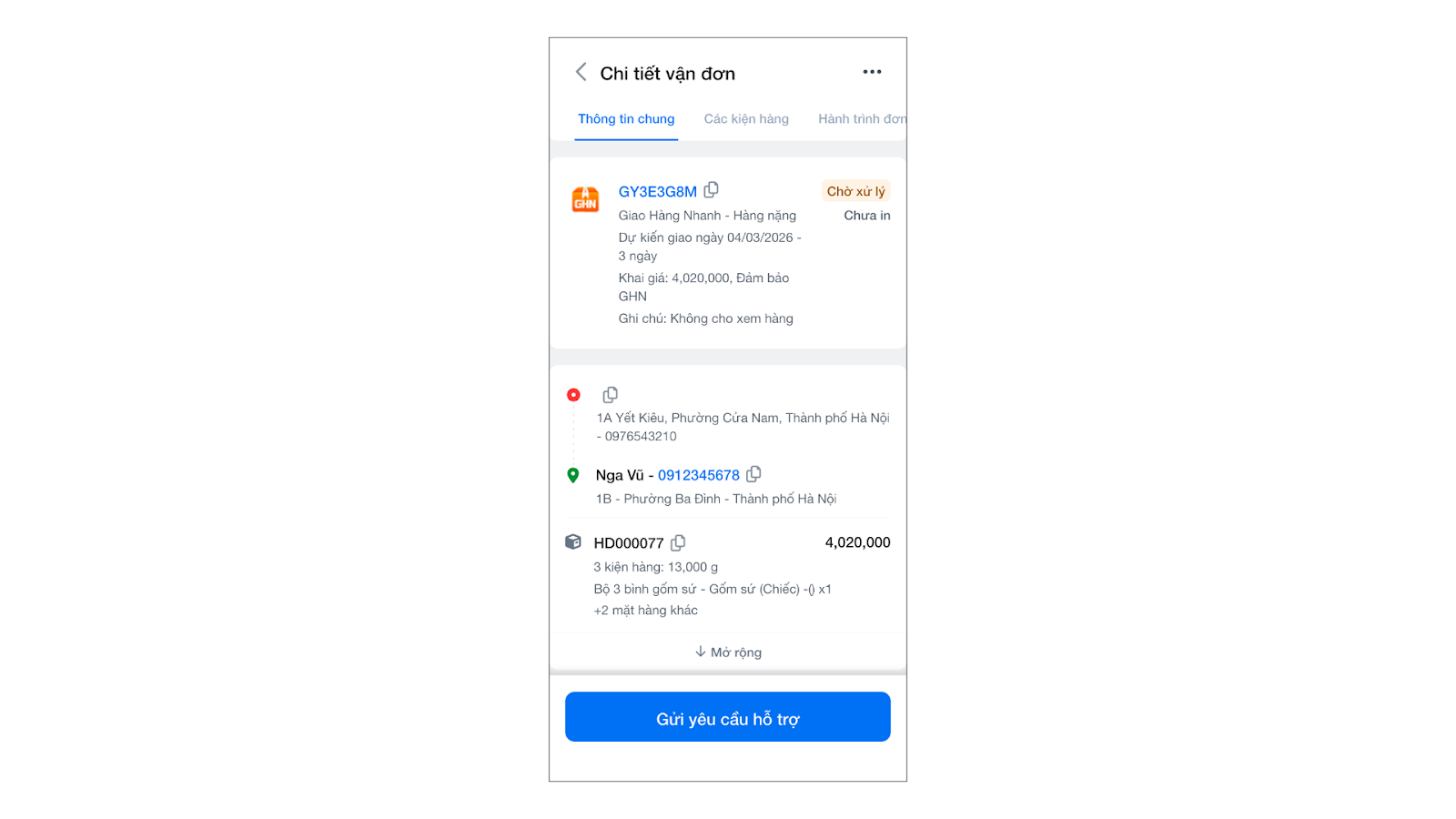 - Tình huống: Bạn muốn tra cứu nhanh thông tin các kiện của đơn hàng vừa tạo ngay trên ứng dụng di động.