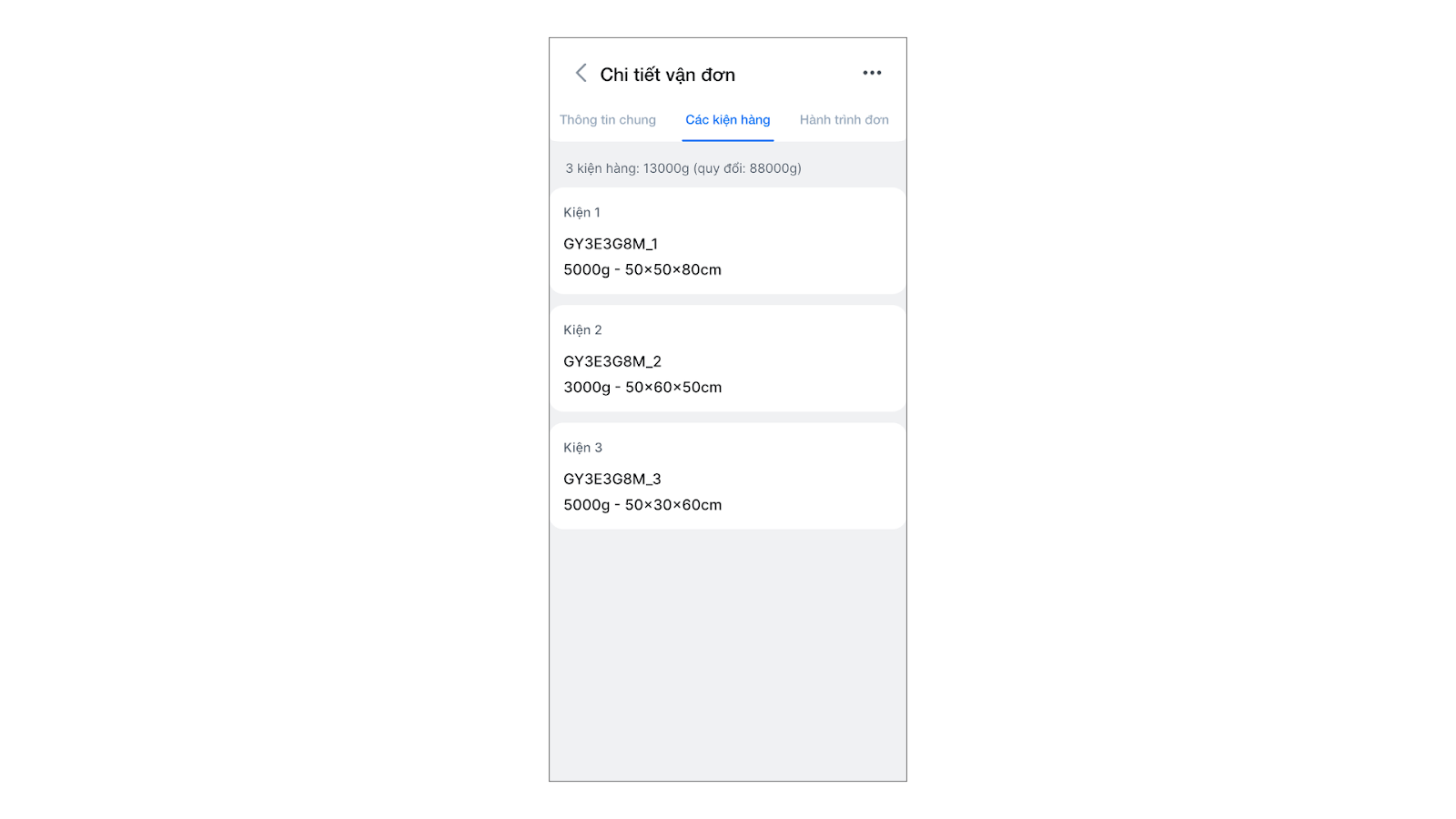 - Để xem chi tiết từng mã kiện, trọng lượng và kích thước, bạn chọn tab Các kiện hàng.
