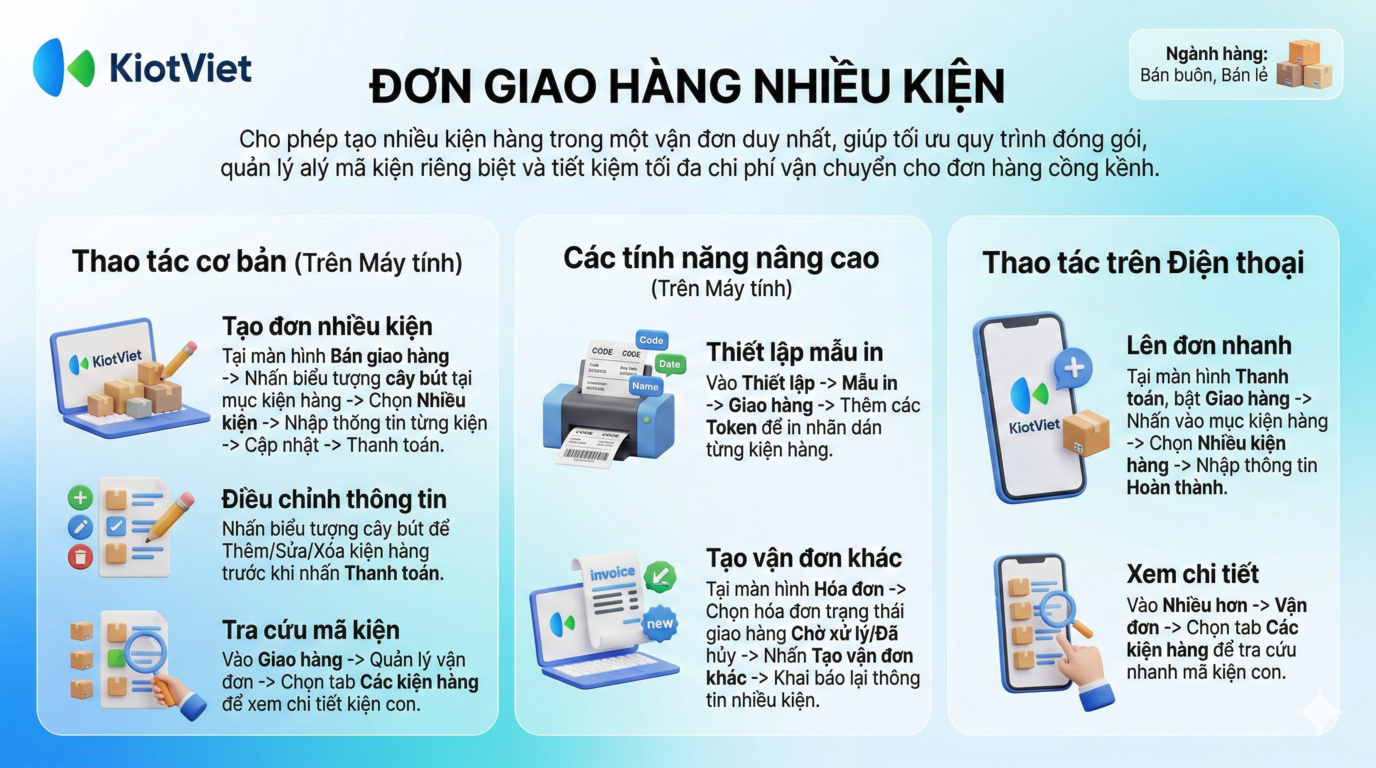 Tính năng Đơn giao hàng nhiều kiện trên ứng dụng di động hỗ trợ cửa hàng thực hiện các thao tác: Tạo đơn giao hàng nhiều kiện, Xem thông tin kiện hàng.