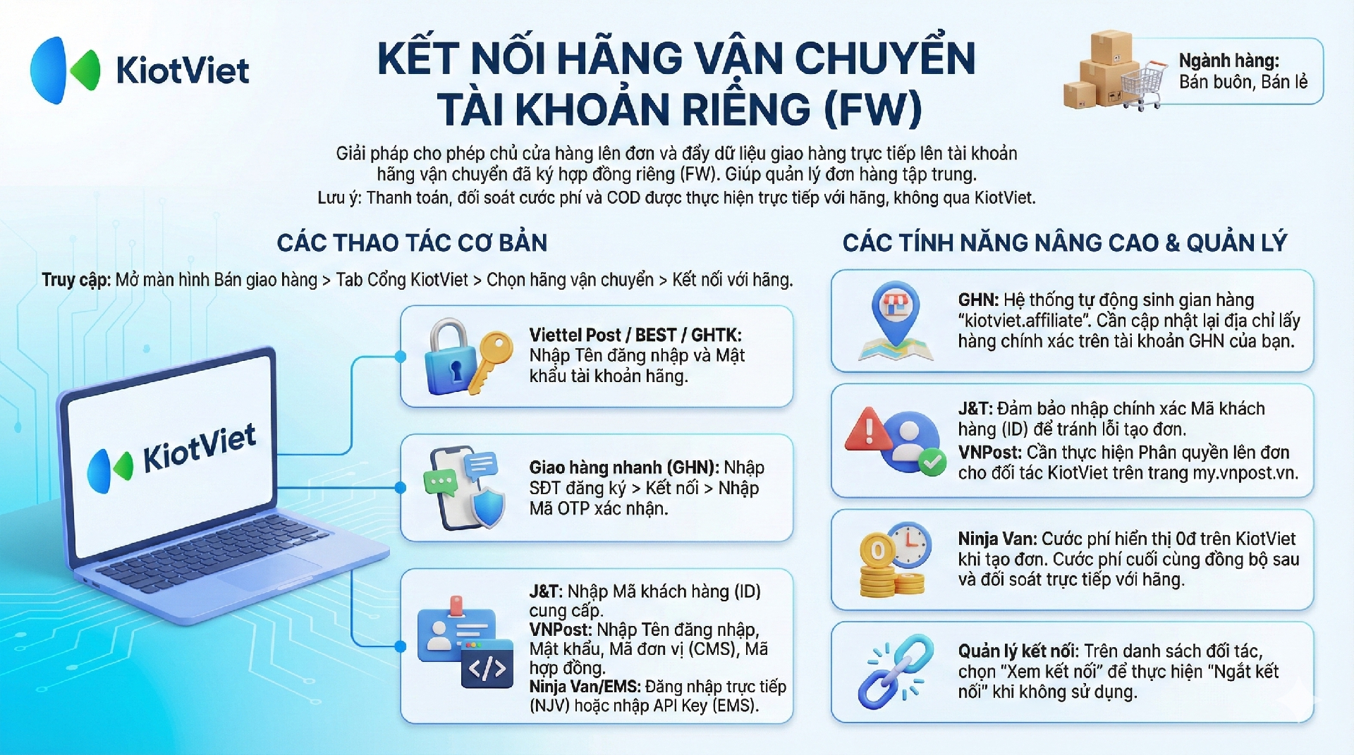 - Việc thanh toán, đối soát gian hàng làm việc trực tiếp với các hãng vận chuyển, không qua KiotViet.