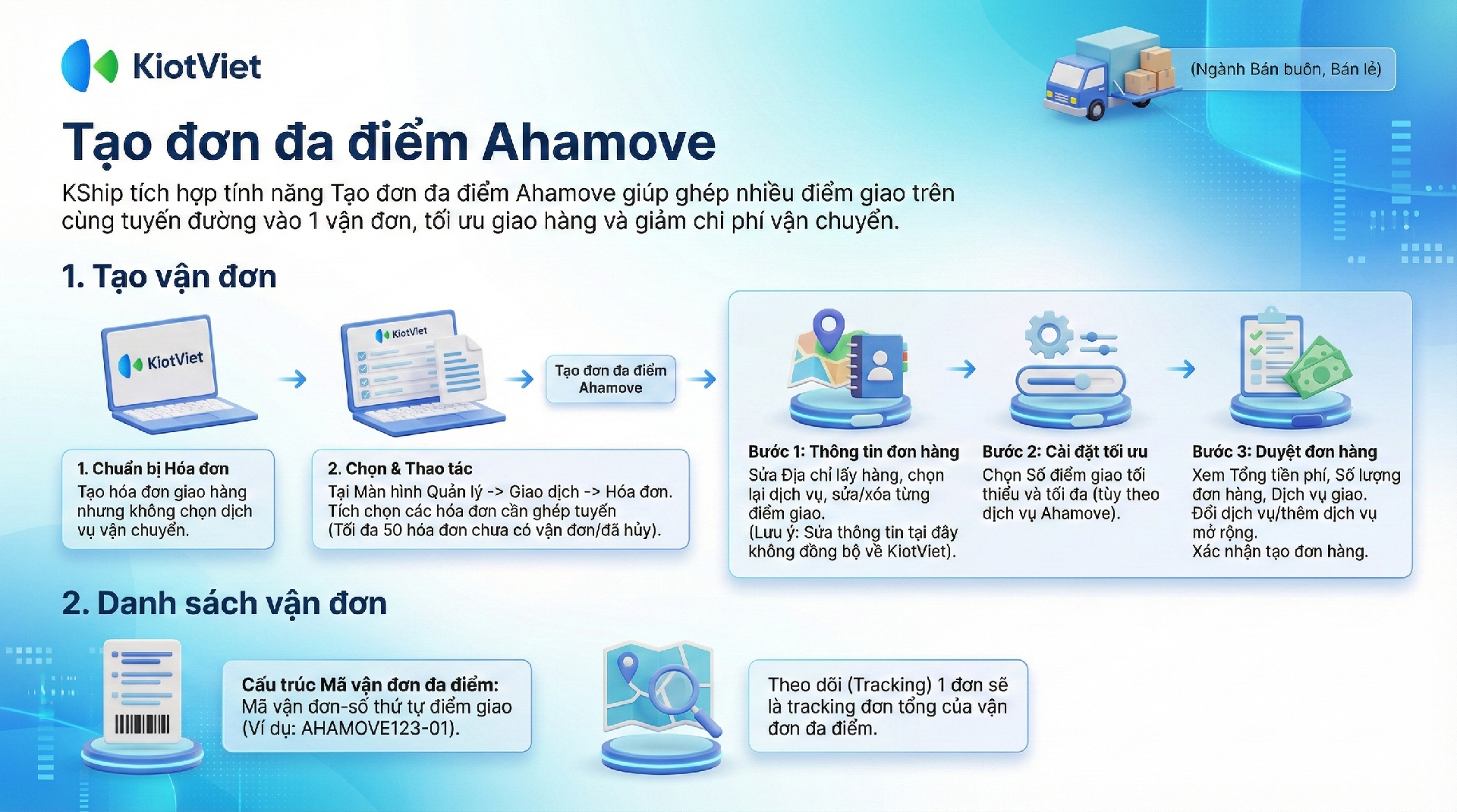 – Để tối ưu giao hàng, tiết kiệm chi phí, KShip tích hợp tính năng Tạo đơn đa điểm của hãng vận chuyển Ahamove. Tính năng này cho phép ghép nhiều điểm giao trên cùng tuyến đường vào 1 vận đơn ahamove để tối ưu việc giao hàng và giảm chi phí giao hàng cho khách.