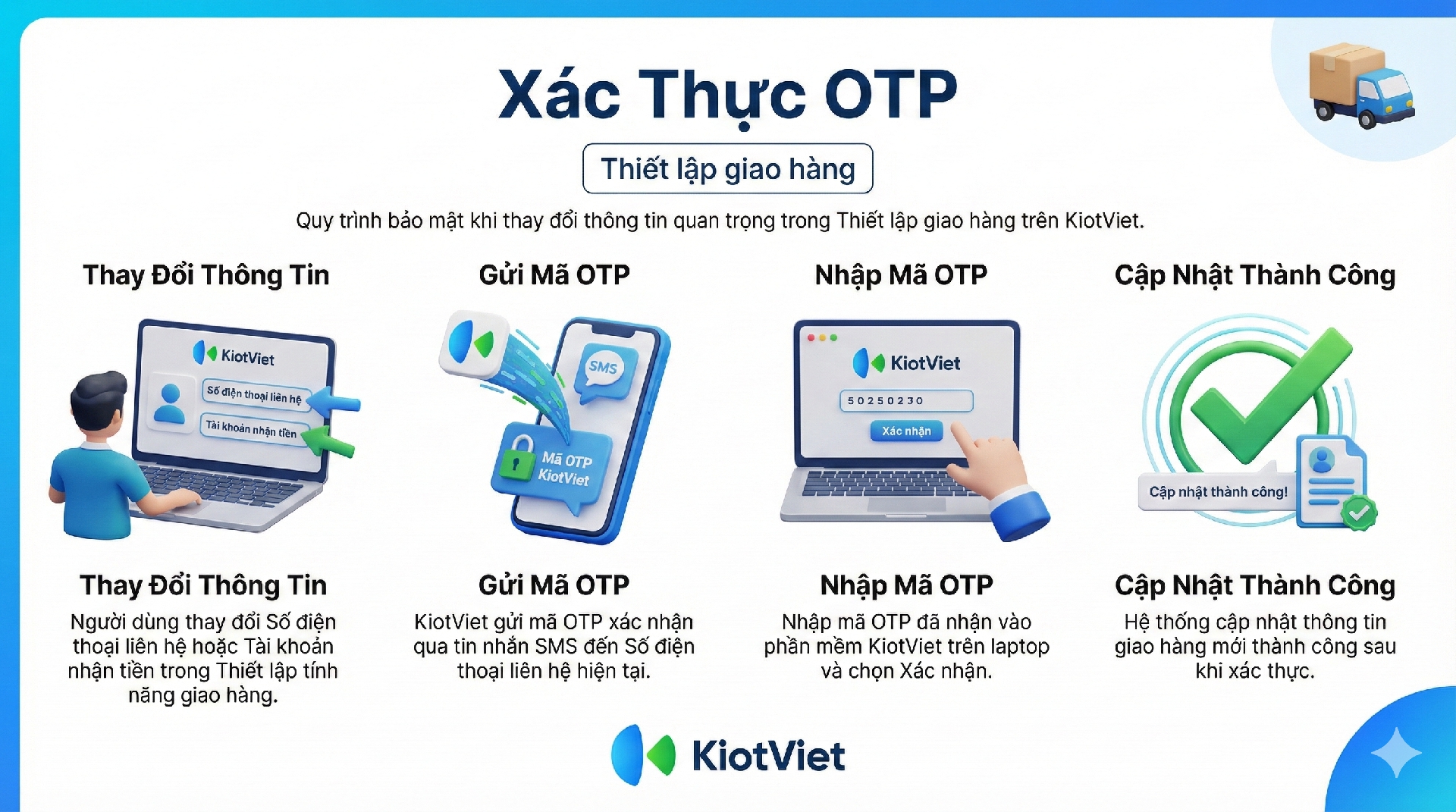 KiotViet sẽ gửi mã OTP xác nhận qua tin nhắn SMS đến Số điện thoại liên hệ hiện tại của gian hàng.