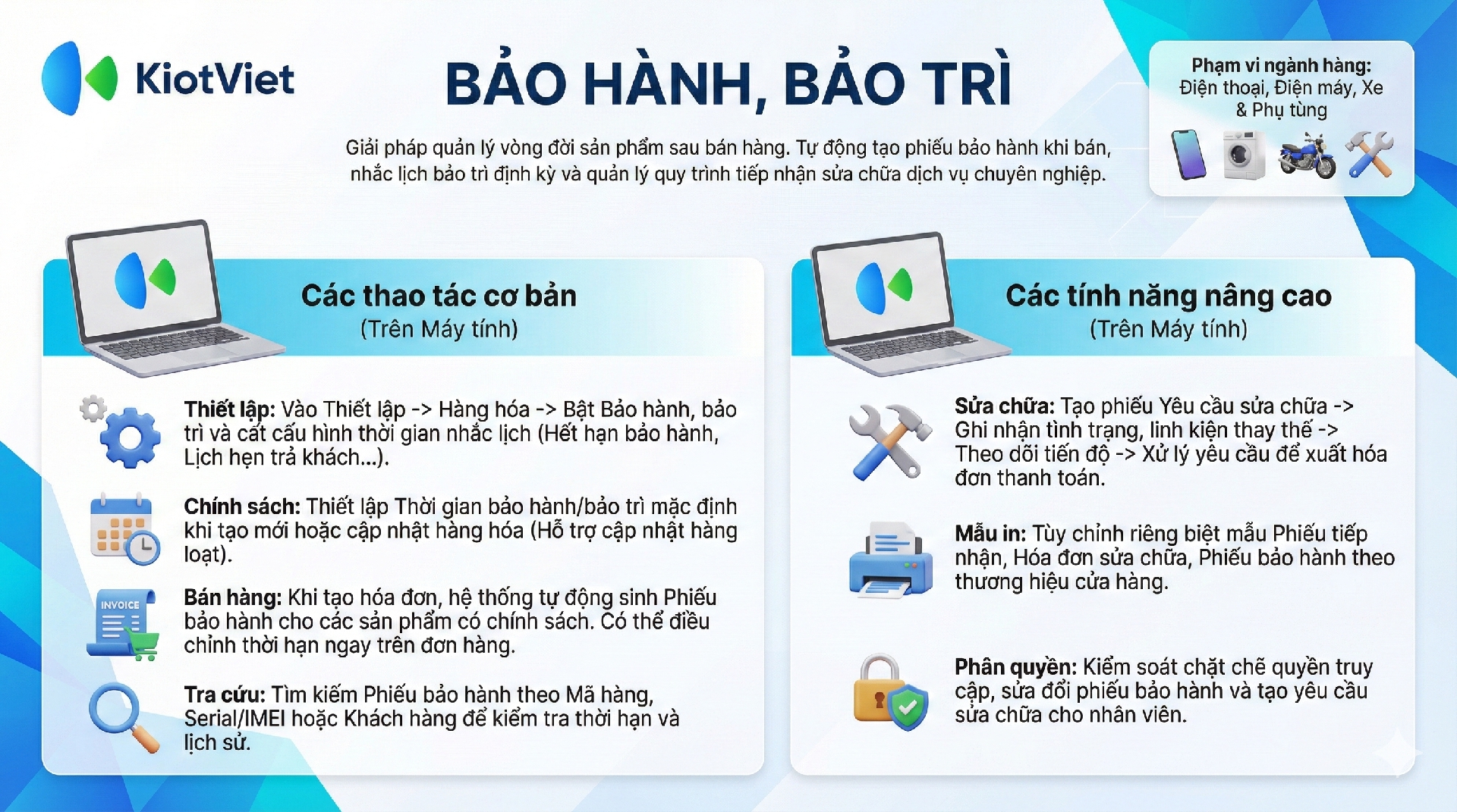 - Giúp chủ cửa hàng và quản lý: Dễ dàng kiểm soát và chuẩn hóa các chính sách bảo hành cho từng loại hàng hóa, đồng thời theo dõi và quản lý hiệu quả các yêu cầu sửa chữa phát sinh, nâng cao uy tín thương hiệu.