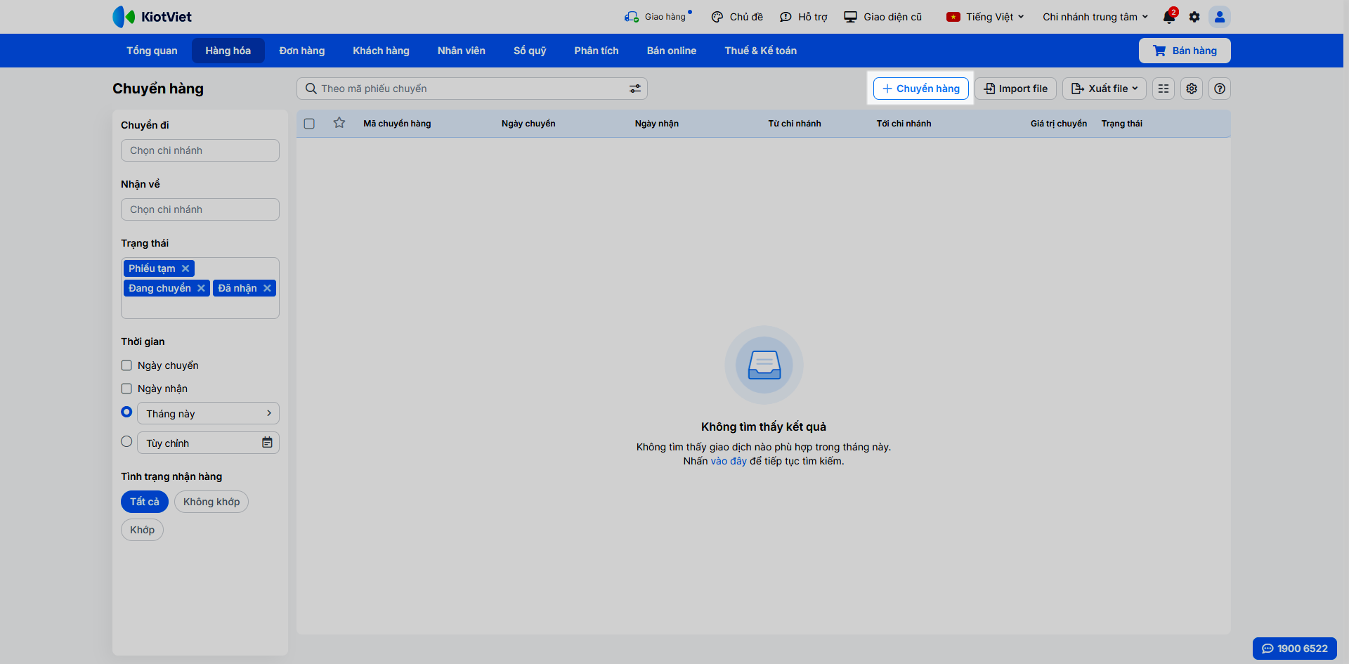 - Tại chi nhánh nhận, bạn cũng vào menu Hàng hóa → Chuyển hàng.