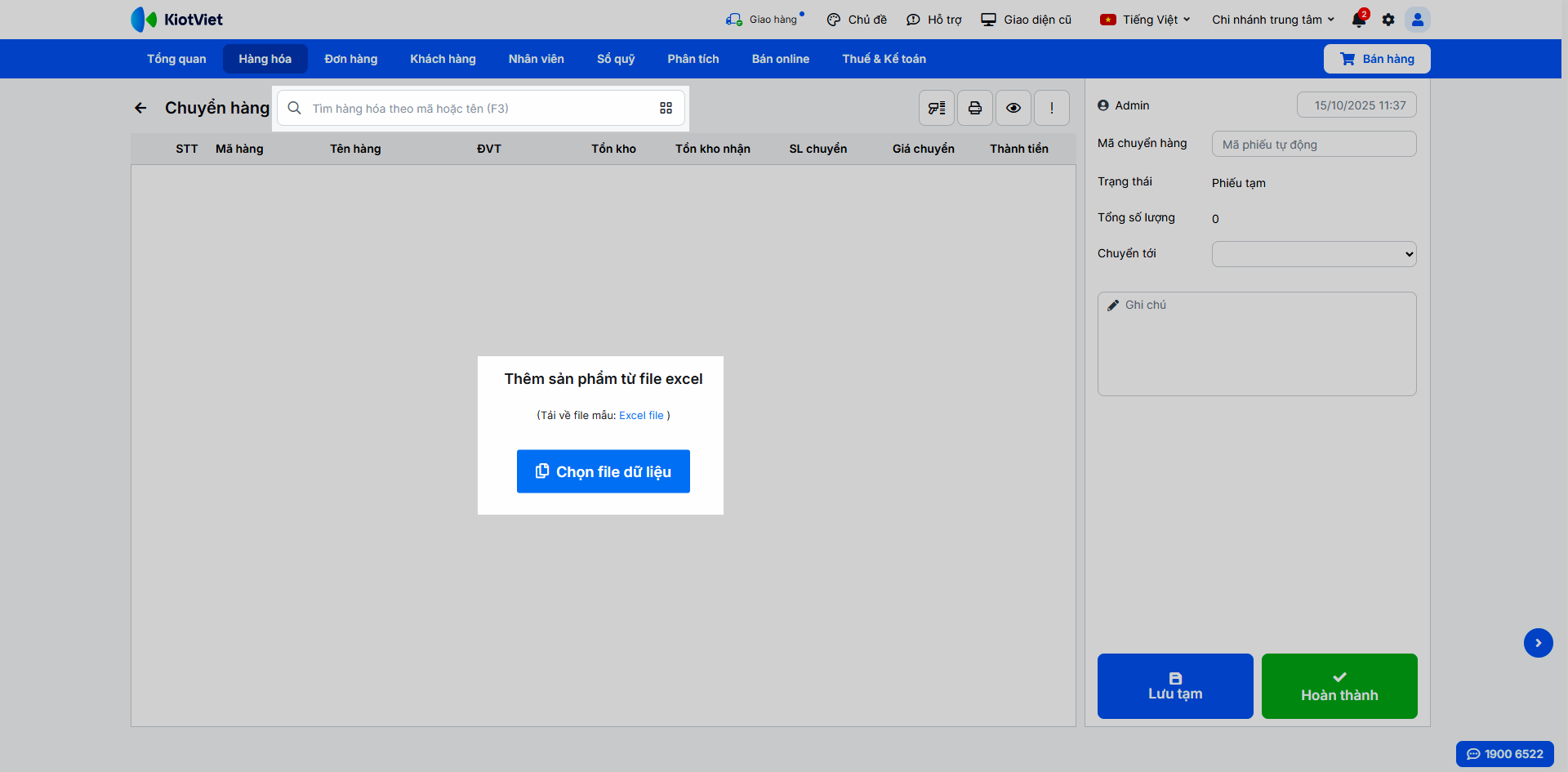 - Thêm hàng hóa vào phiếu. Bạn có thể thêm bằng cách tìm kiếm, quét mã vạch hoặc nhập từ file Excel.