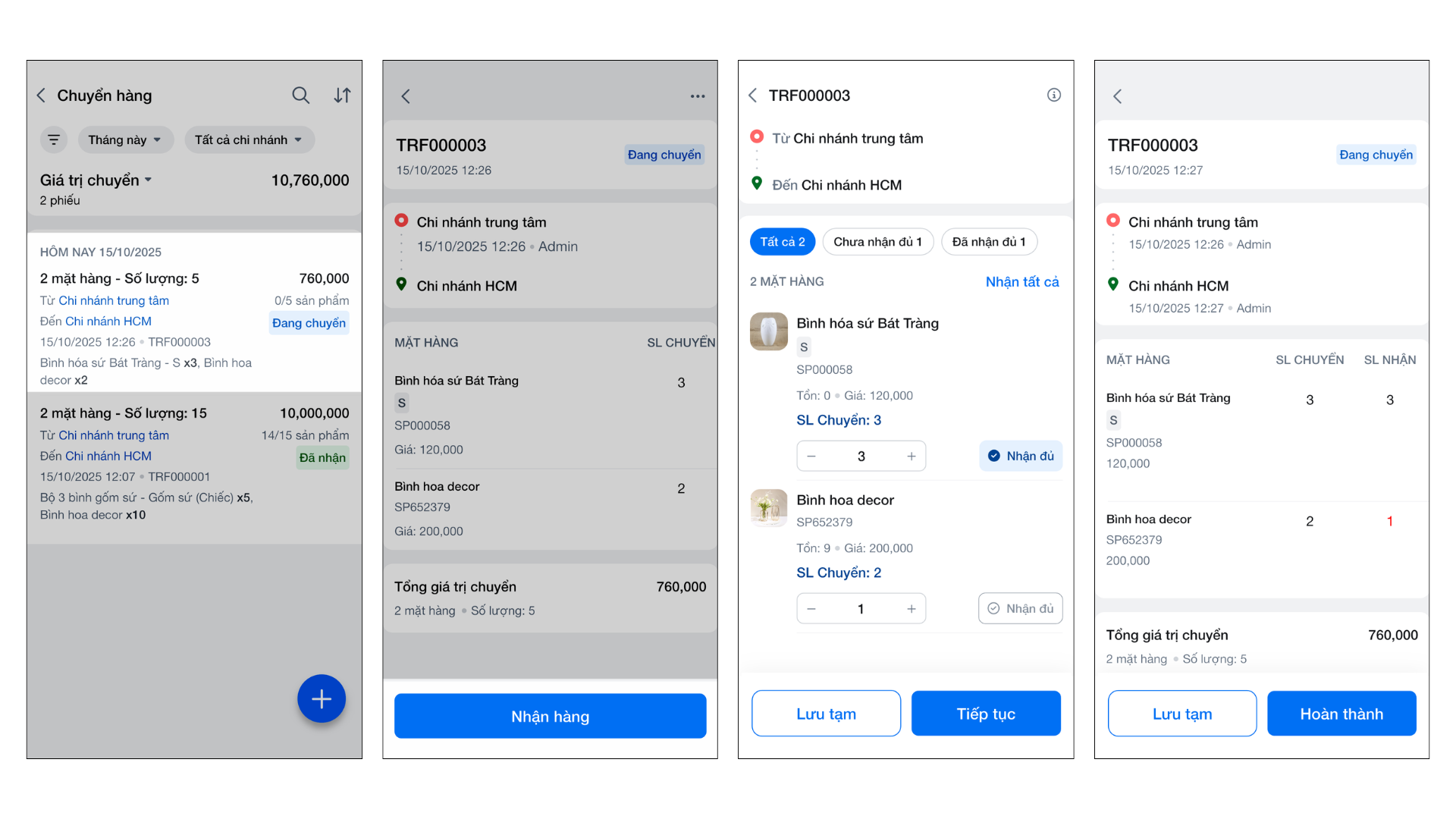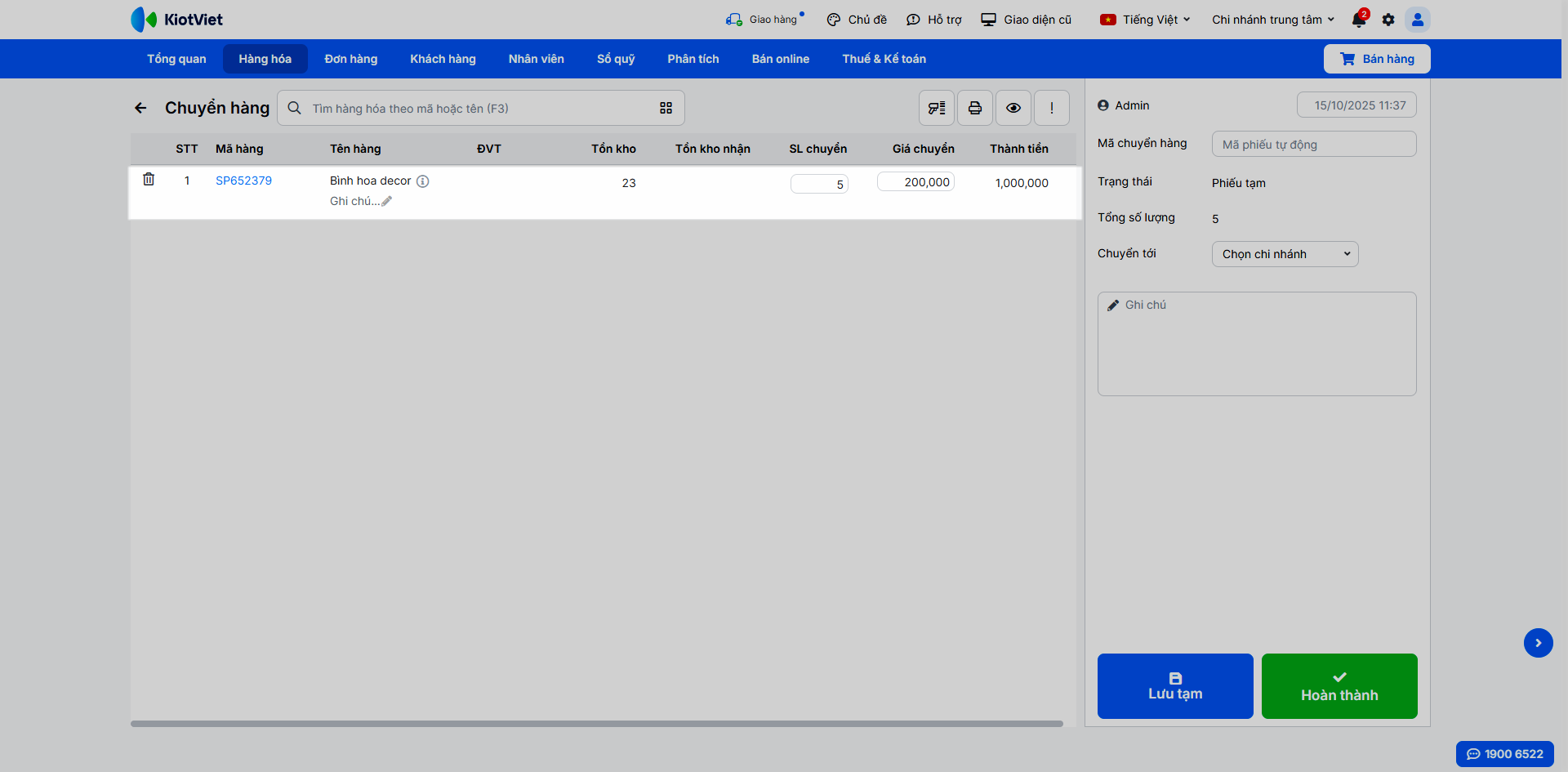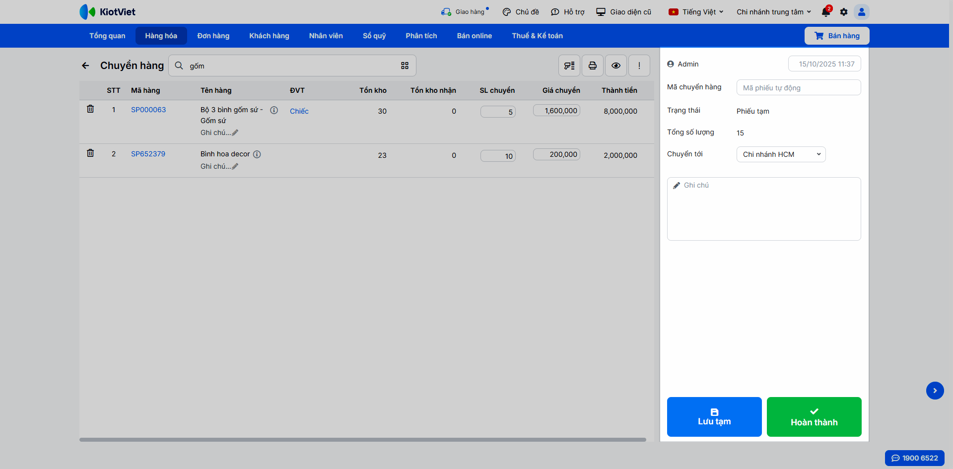 - Sau khi thêm đủ hàng hóa, chọn Chi nhánh nhận, kiểm tra lại thông tin chung và chạm Hoàn thành hoặc Lưu tạm.