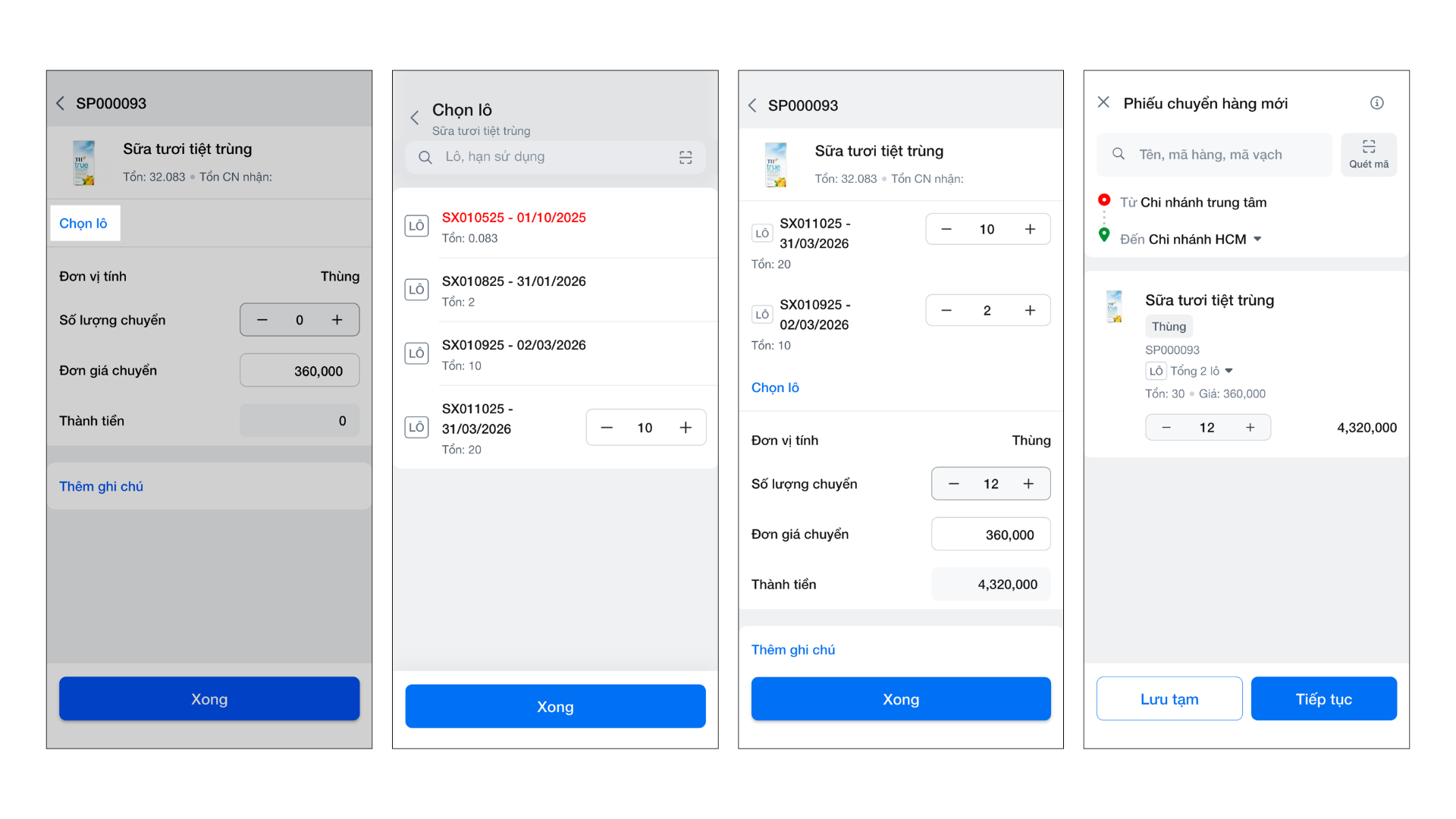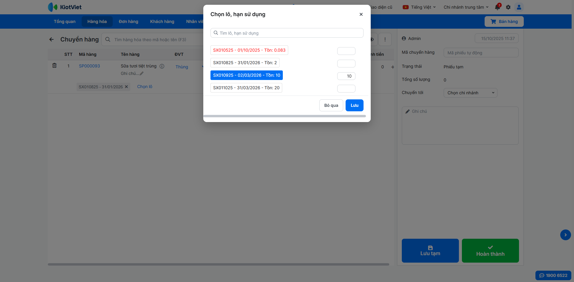 - Bạn có thể chỉnh sửa chi tiết (số lượng, giá chuyển, ghi chú), thêm hoặc xóa lô trước khi nhấn Xong.