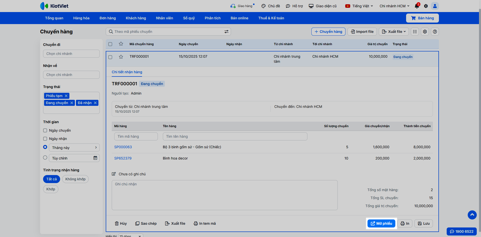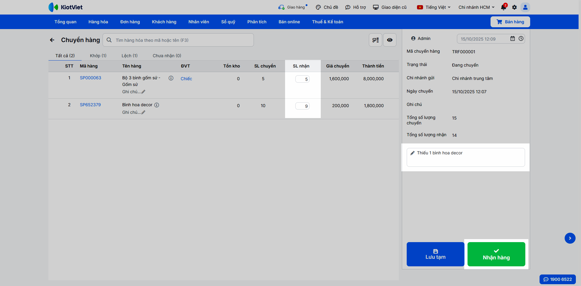 - Nhấn Nhận hàng để hoàn tất. Tồn kho tại hai chi nhánh sẽ được tự động cập nhật. Lưu ý: Thời gian nhận hàng không được sớm hơn thời gian chuyển hàng.
