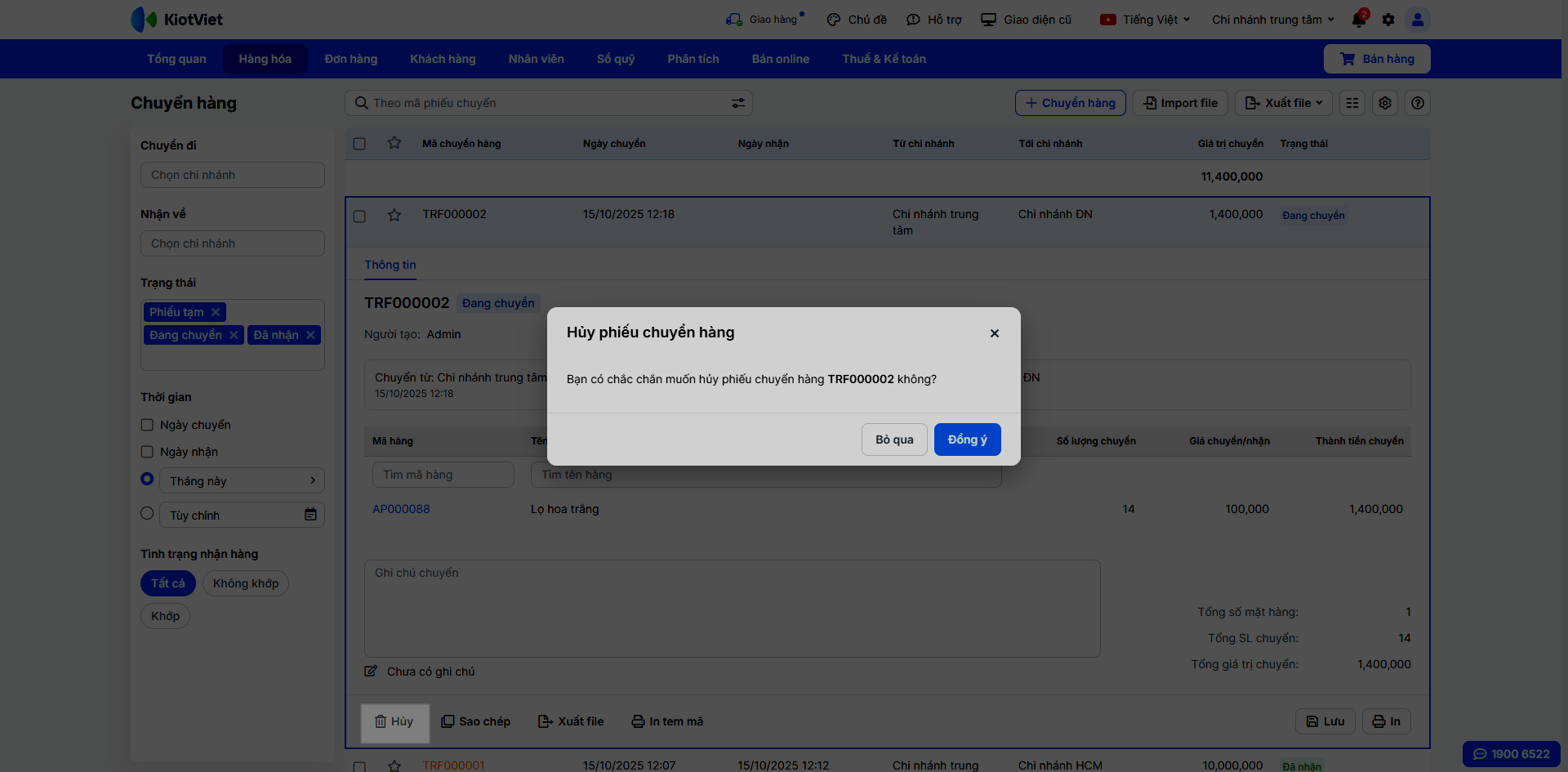 - Nhấn vào nút Hủy và xác nhận. Tồn kho sẽ được tự động hoàn lại chi nhánh chuyển với phiếu chuyển hàng ở trạng thái Đang chuyển/ Đã nhận.