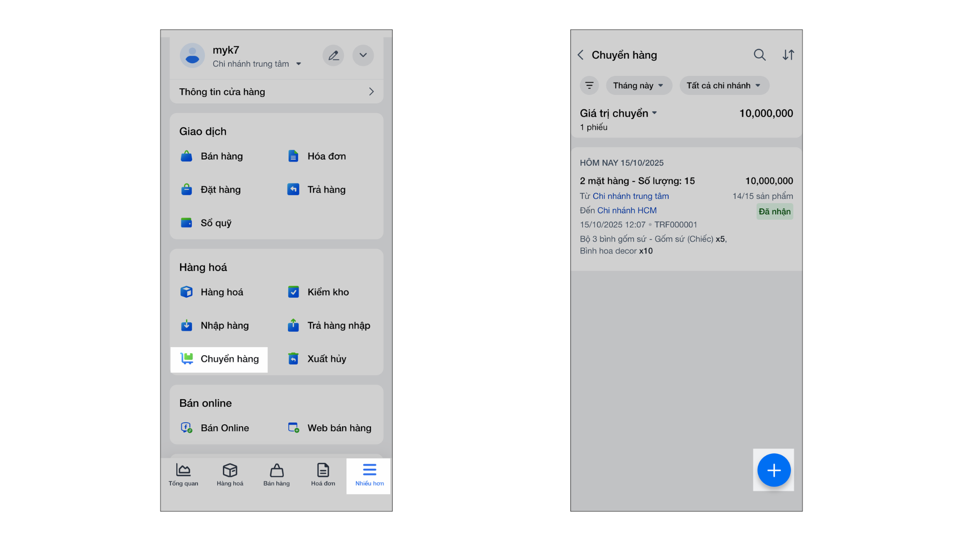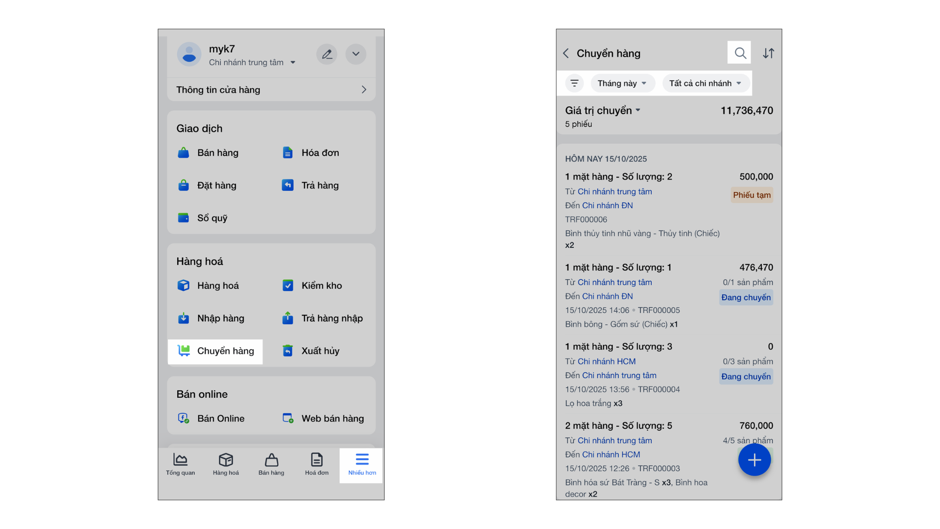 Tính năng Chuyển hàng cho phép các cửa hàng có nhiều chi nhánh hoặc quản lý đa kho dễ dàng thực hiện việc luân chuyển hàng hóa nội bộ.