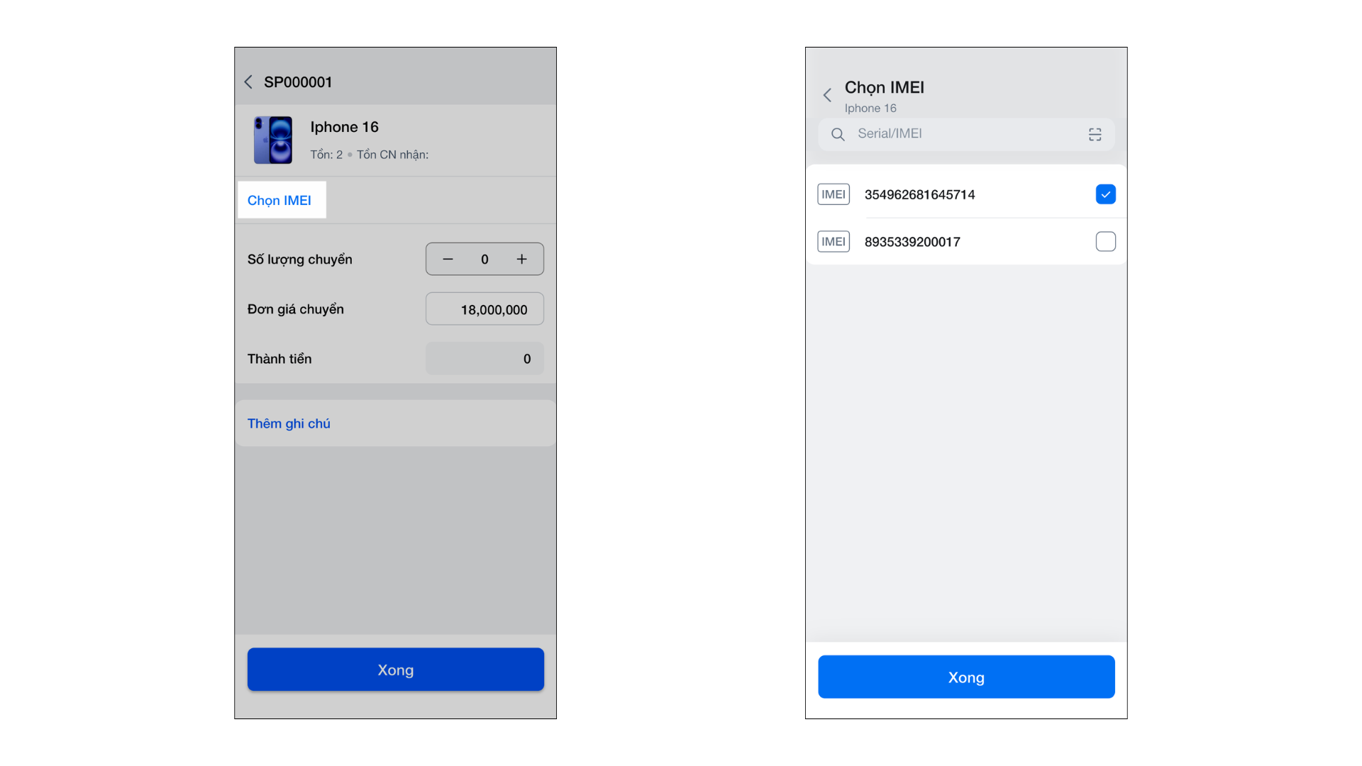 - Đối với hàng hóa quản lý theo Serial/IMEI: Sau khi chọn sản phẩm, nhập hoặc quét các mã IMEI cần chuyển.
