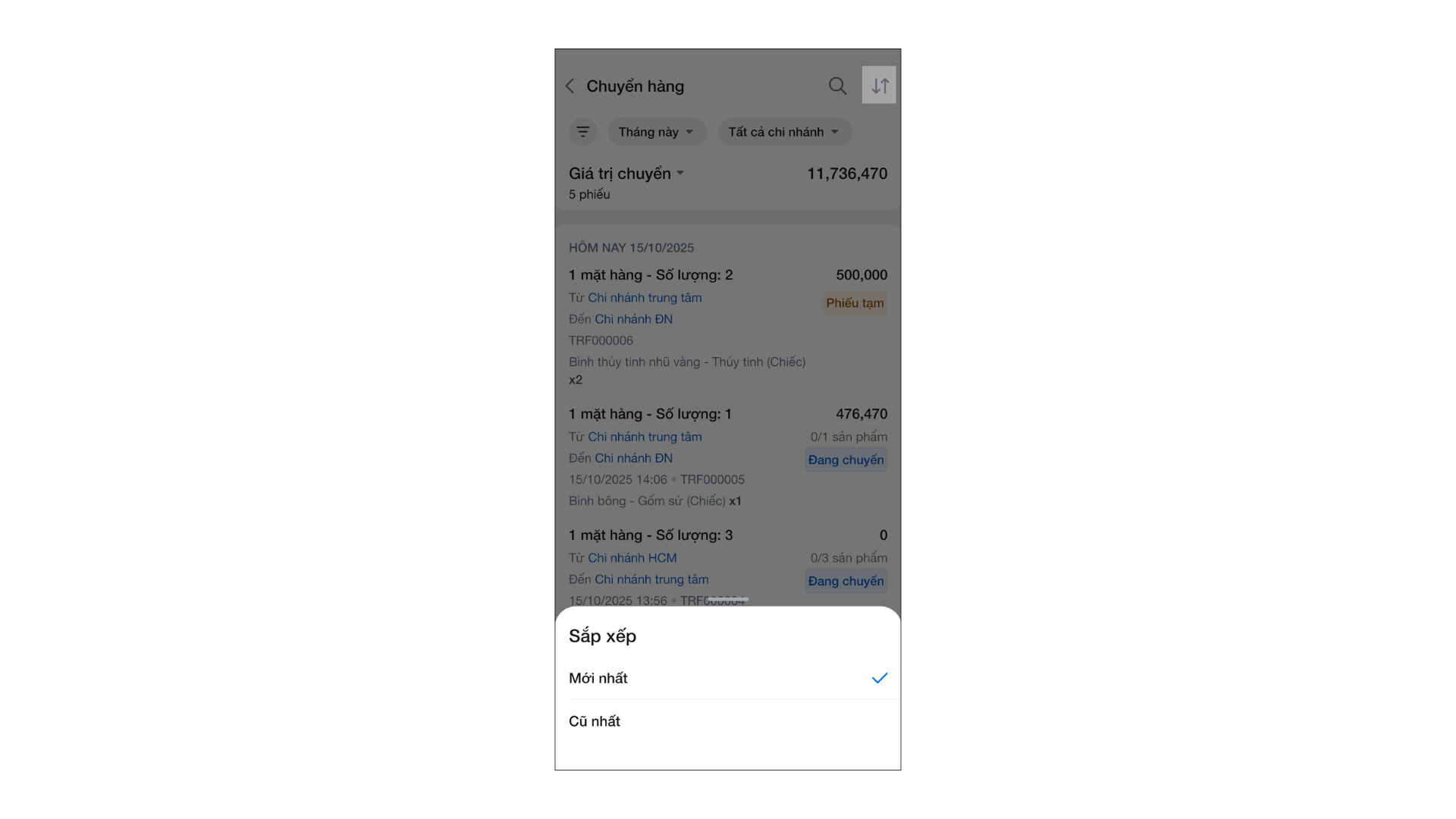 - Để sắp xếp danh sách phiếu chuyển mới nhất/ cũ nhất, bạn chạm biểu tượng mũi tên.