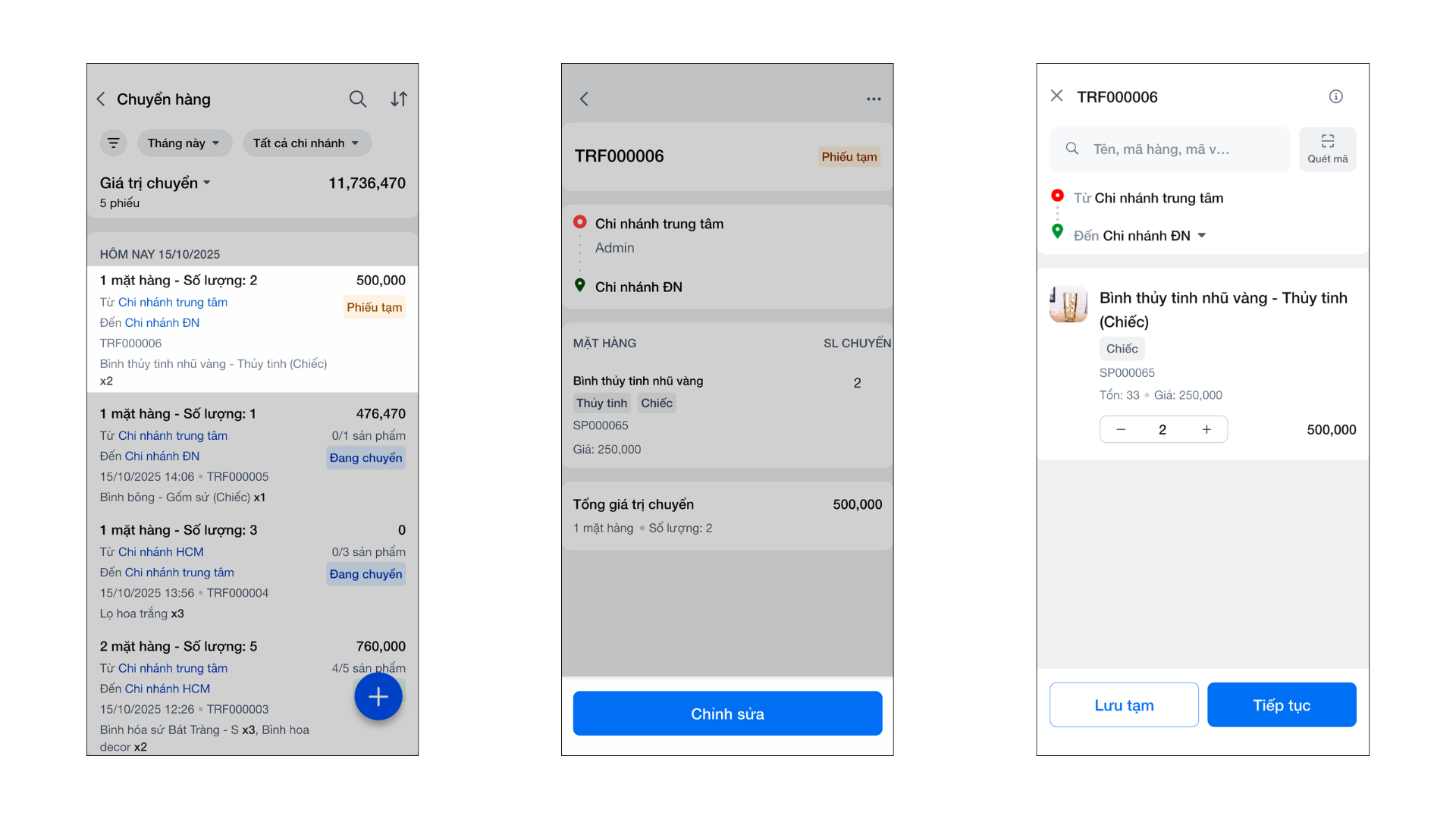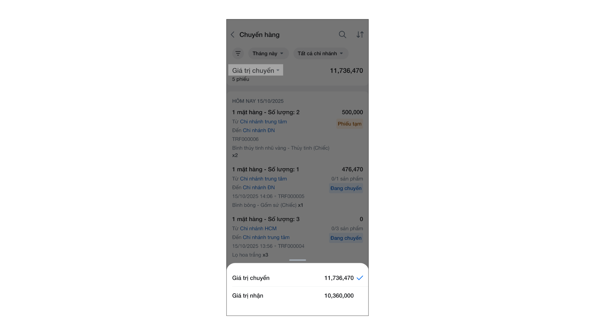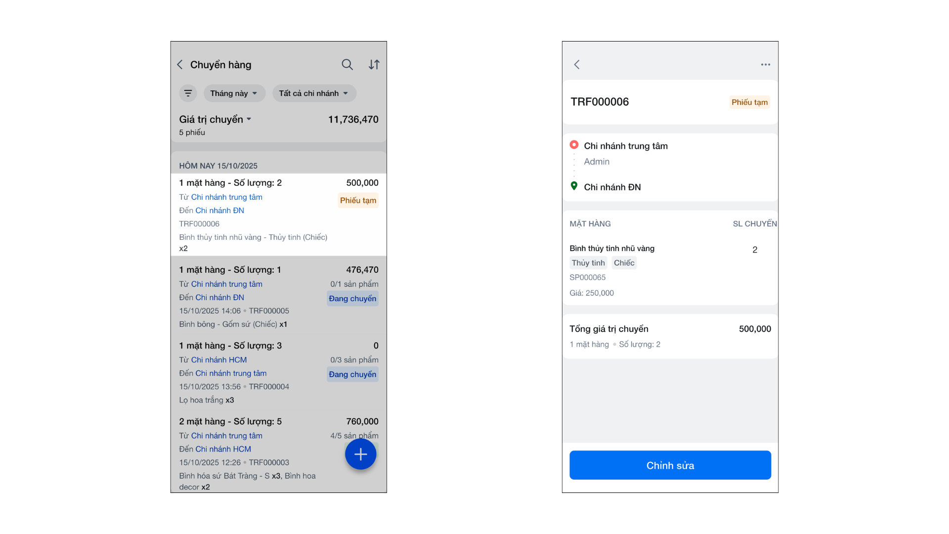 - Tình huống: Bạn cần xem danh sách, xem chi tiết hàng hóa, chỉnh sửa, hủy hoặc in một phiếu chuyển ngay trên ứng dụng di động.