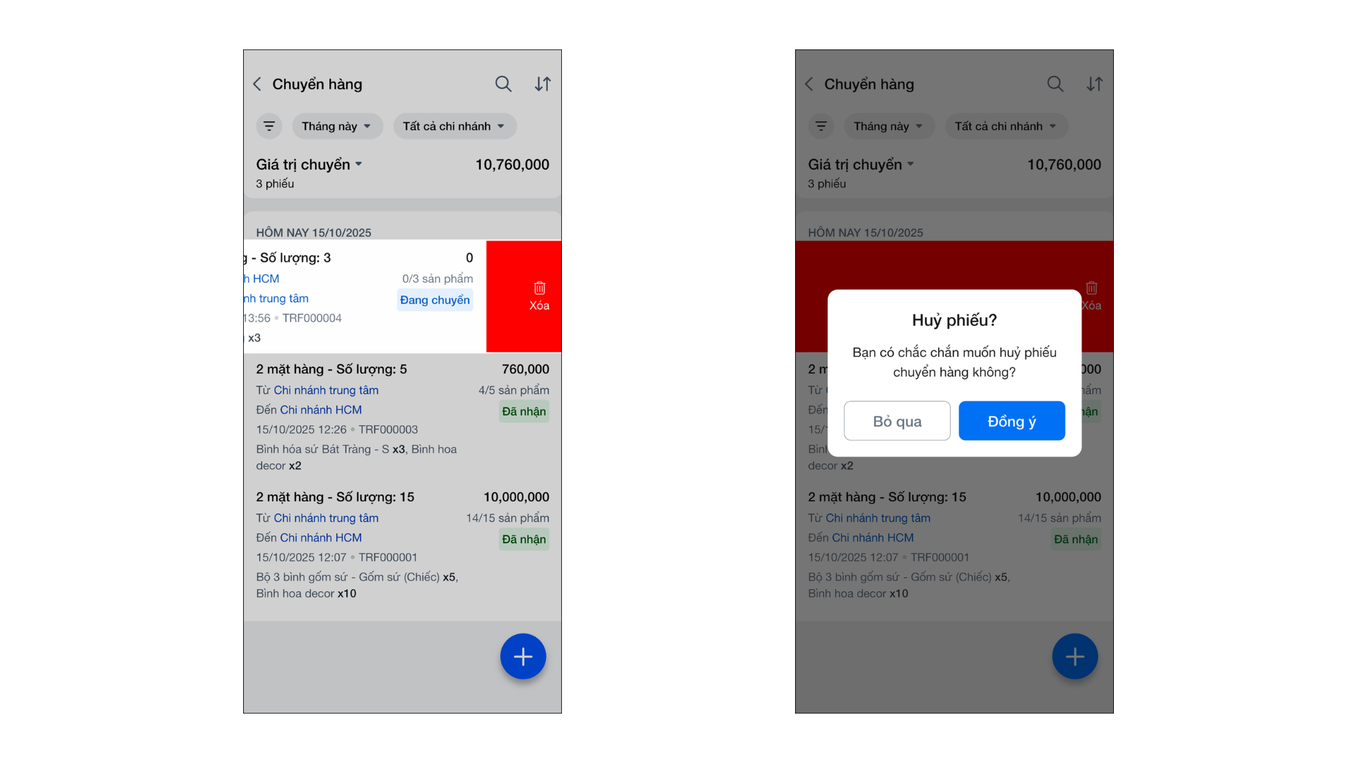 - Hủy: Vuốt phiếu chuyển sang trái và chọn Hủy, hoặc mở chi tiết phiếu và chọn 3 chấm → Hủy phiếu.