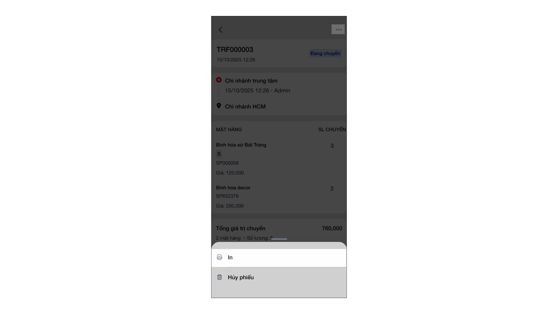 - In: Mở chi tiết phiếu chuyển, chạm vào biểu tượng menu và chọn In (yêu cầu đã kết nối máy in).