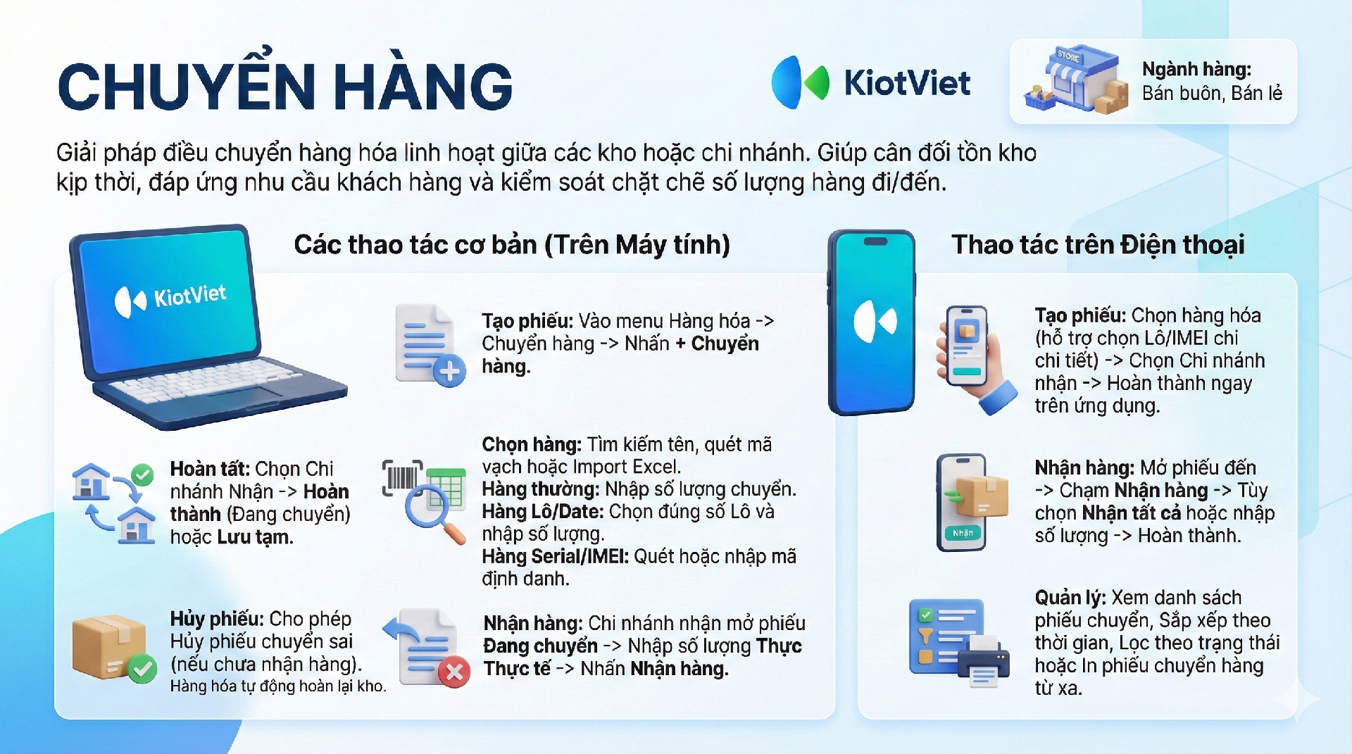 Tính năng Chuyển hàng trên ứng dụng KiotViet hỗ trợ đầy đủ các thao tác: Tạo phiếu, Nhận hàng và Xem danh sách phiếu, bao gồm cả các hàng hóa quản lý theo Lô – Hạn sử dụng, Serial/Imei.