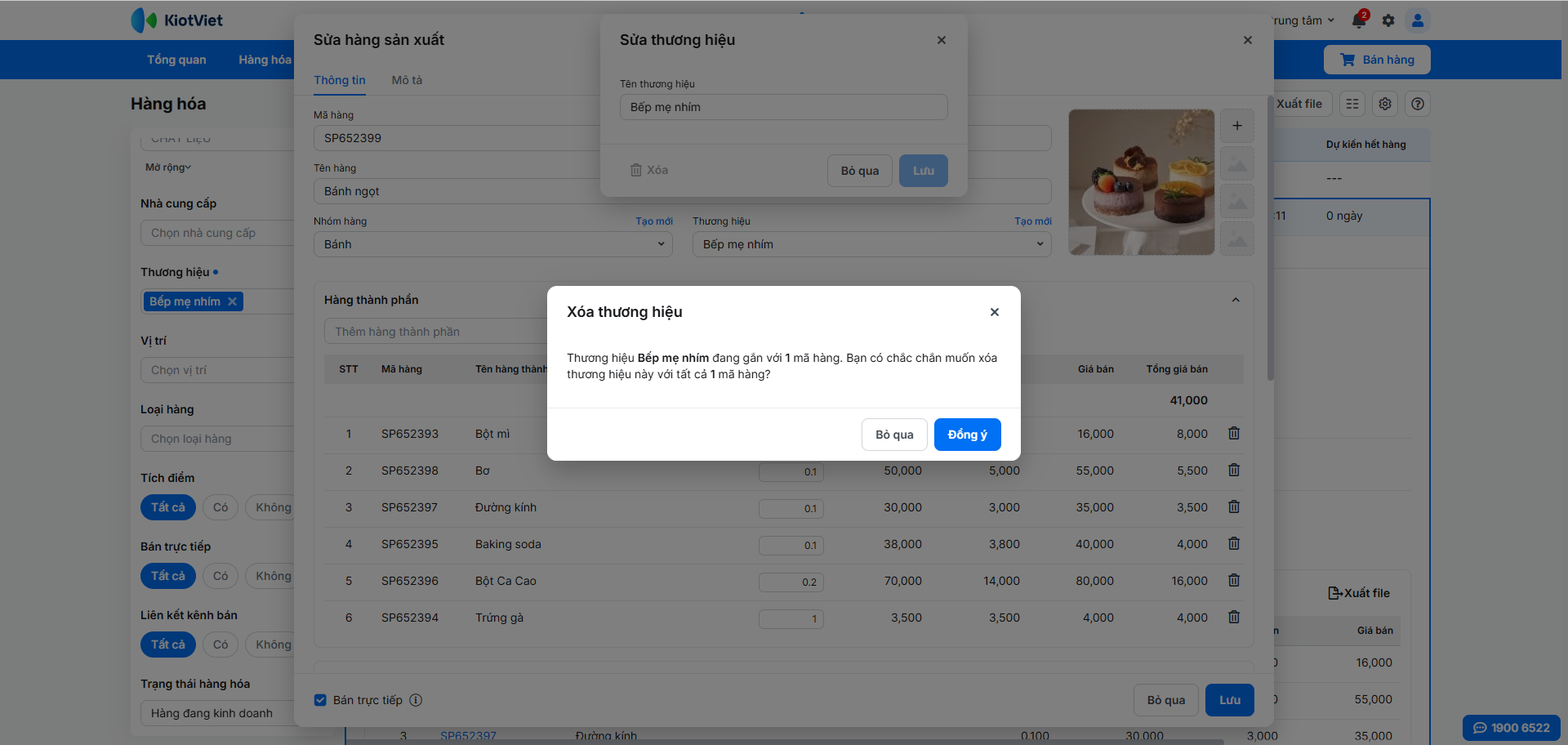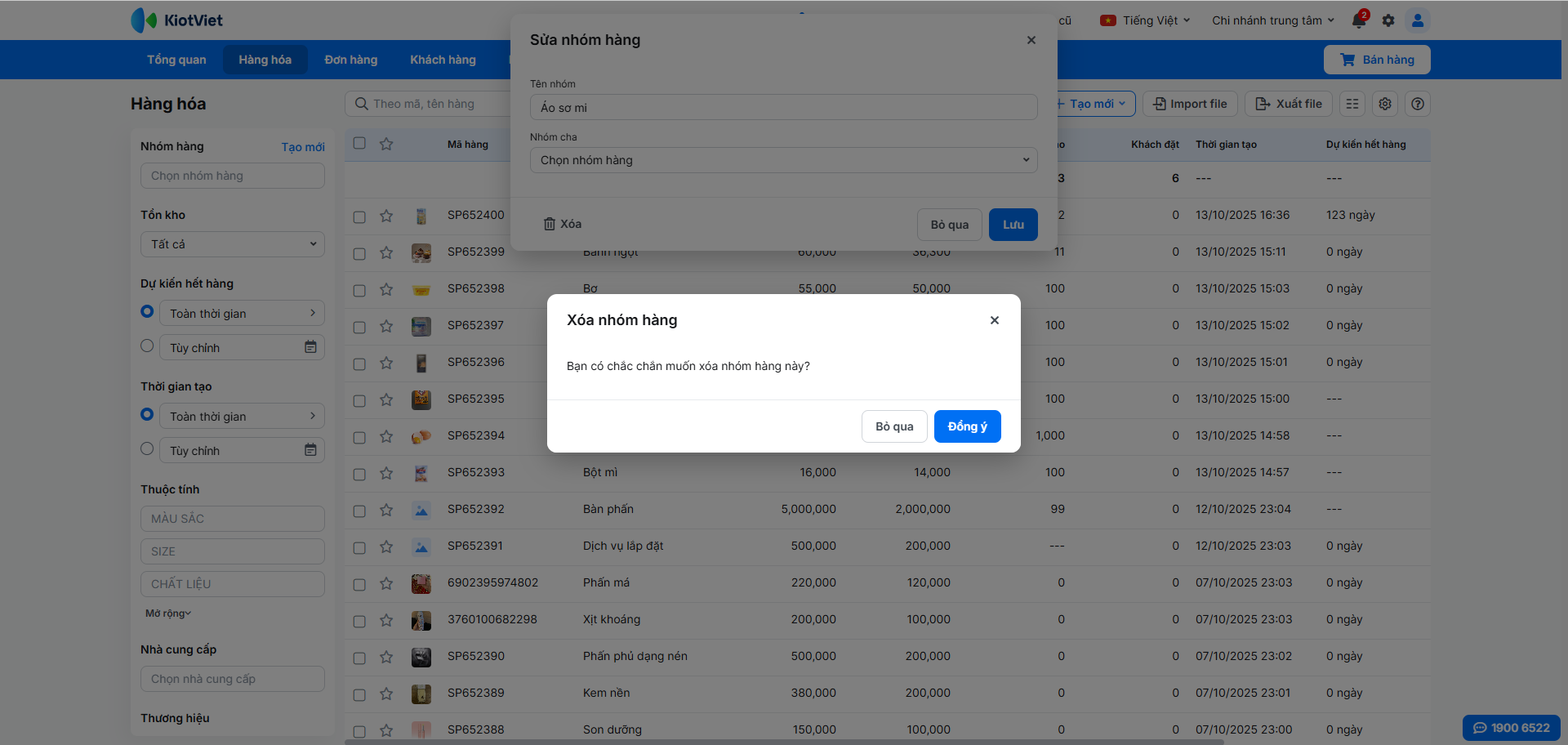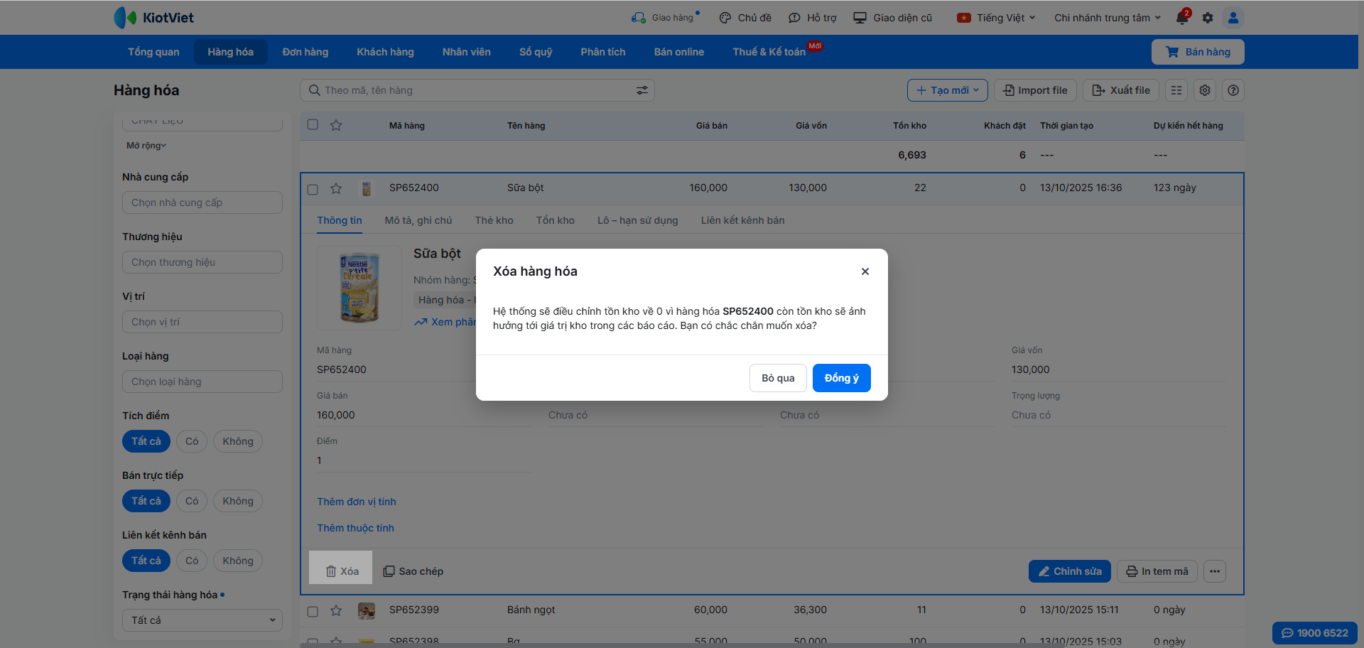 - Hệ thống sẽ yêu cầu xác nhận. Nếu hàng hóa có tồn kho khác 0, hệ thống sẽ gợi ý tạo phiếu kiểm kho để điều chỉnh tồn về 0 trước khi xóa.