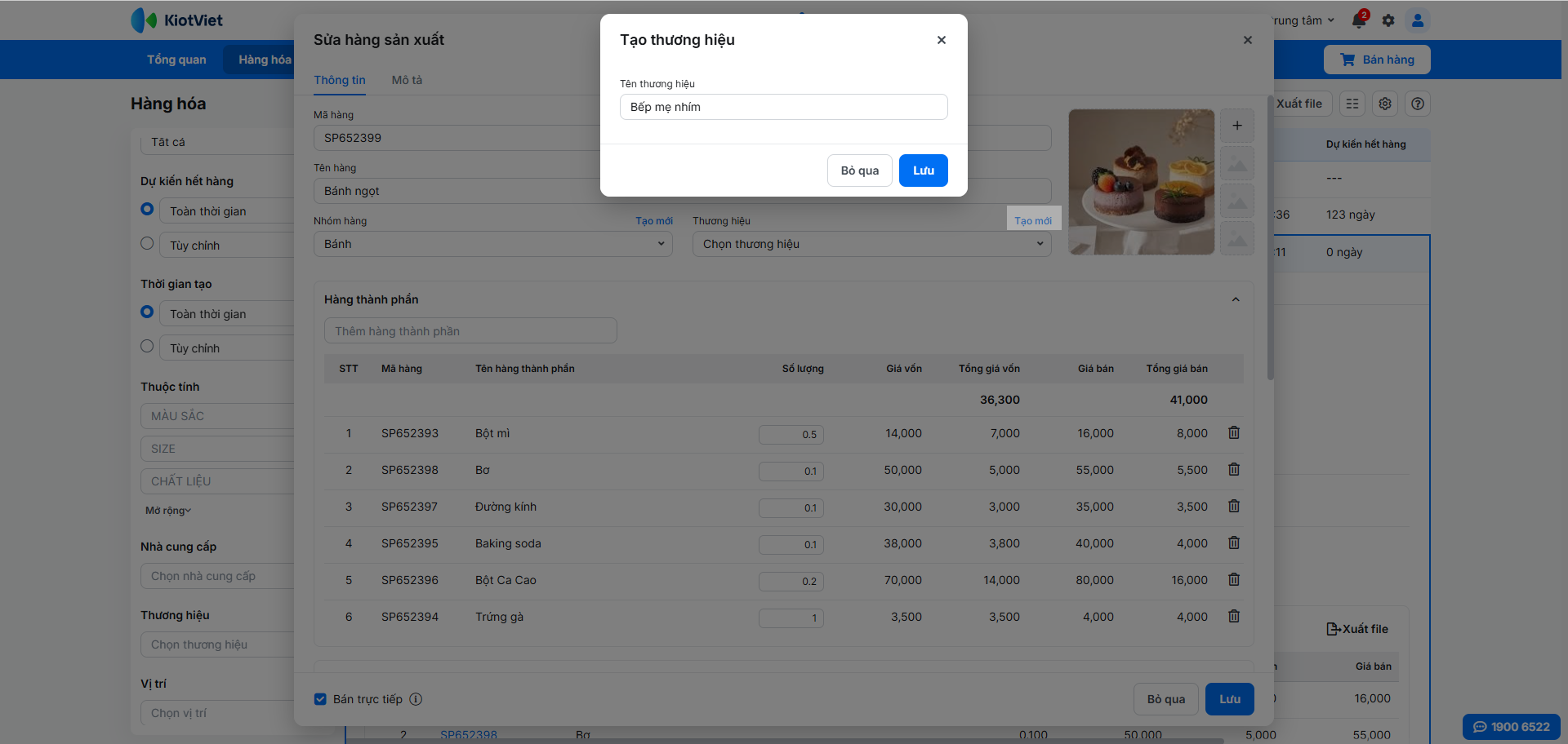 - Khi thêm mới hoặc cập nhật một hàng hóa, tại mục Thương hiệu, nhấn Tạo mới.