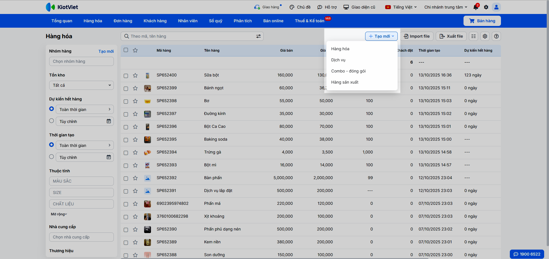 - Tại màn hình Danh sách hàng hóa, nhấn nút + Tạo mới và chọn loại hàng hóa phù hợp: