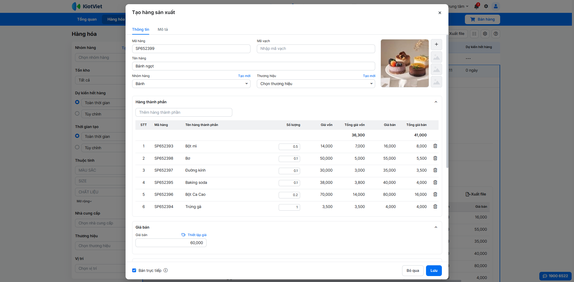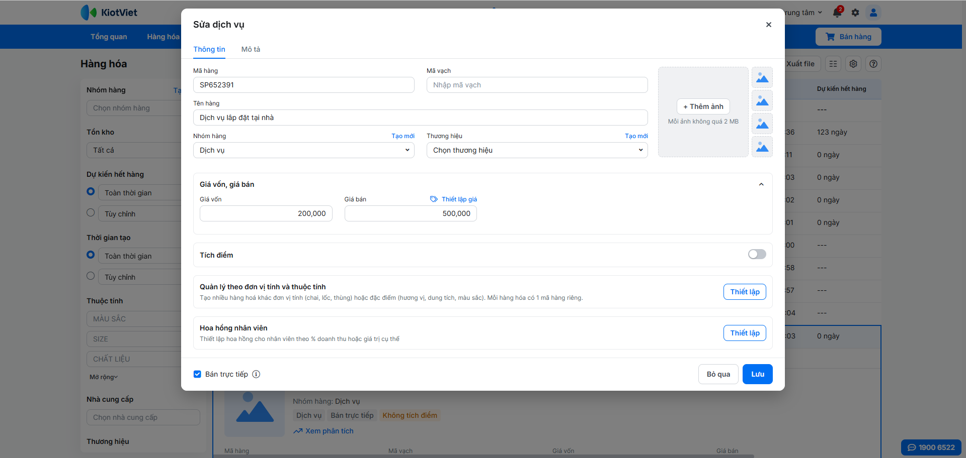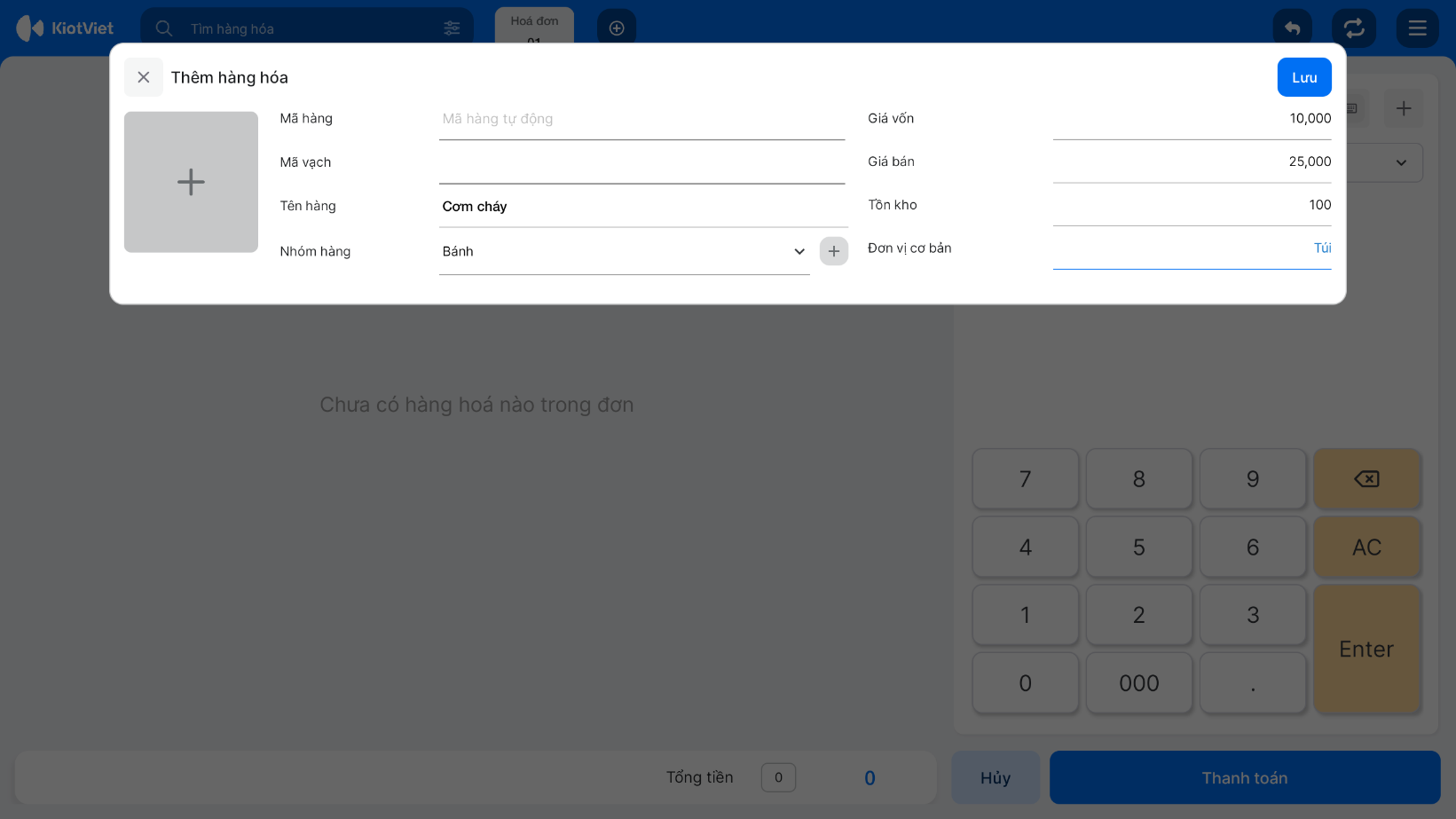 - Điền các thông tin cơ bản trong pop-up hiện ra và Lưu. Sản phẩm sẽ được tự động thêm vào danh sách hàng hóa và hóa đơn.