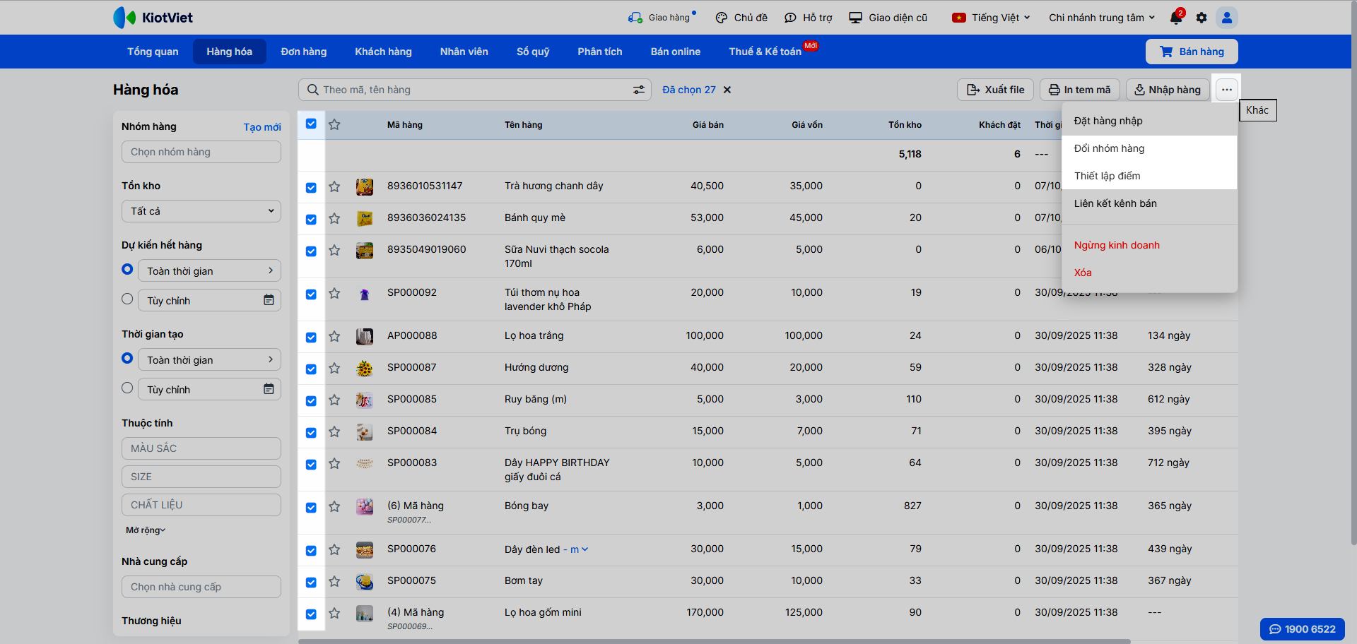 - Bạn cũng có thể chỉnh sửa các thông tin về nhóm hàng hoặc điểm cho nhiều sản phẩm bằng cách tích chọn các sản phẩm → nhấn 3 chấm và chọn thao tác cần thực hiện:
