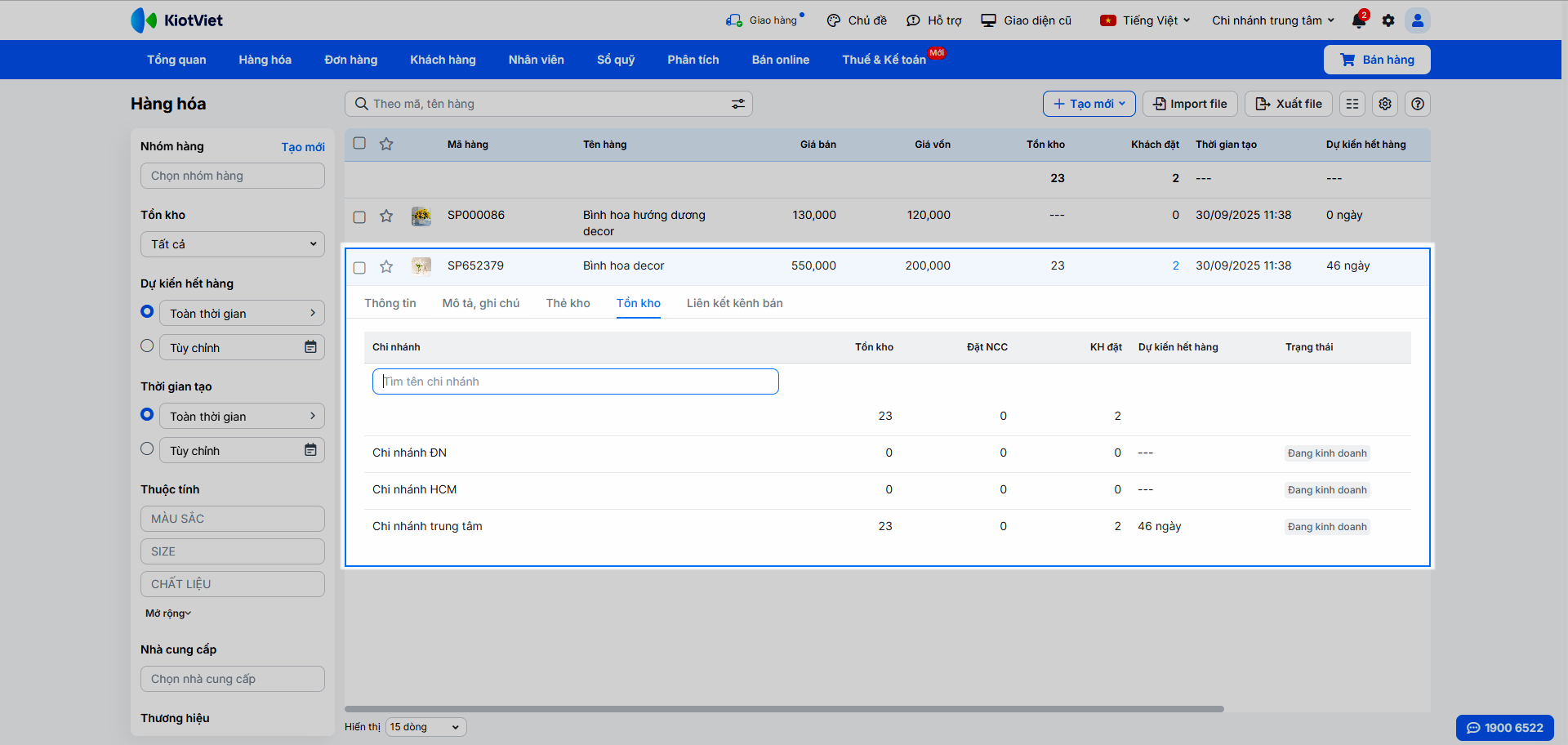 - Chọn tab Tồn kho để xem số lượng tồn hiện tại ở từng chi nhánh.