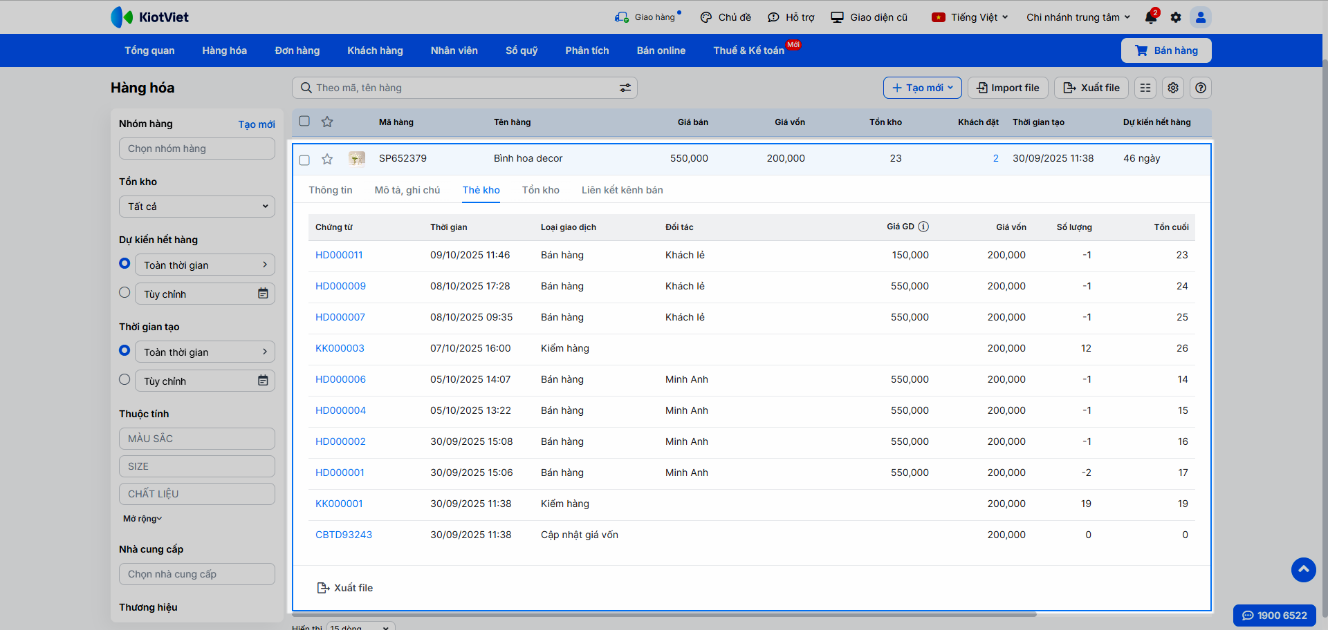 - Chọn tab Thẻ kho để xem chi tiết lịch sử thay đổi số lượng qua các giao dịch (nhập hàng, bán hàng, kiểm kho…).