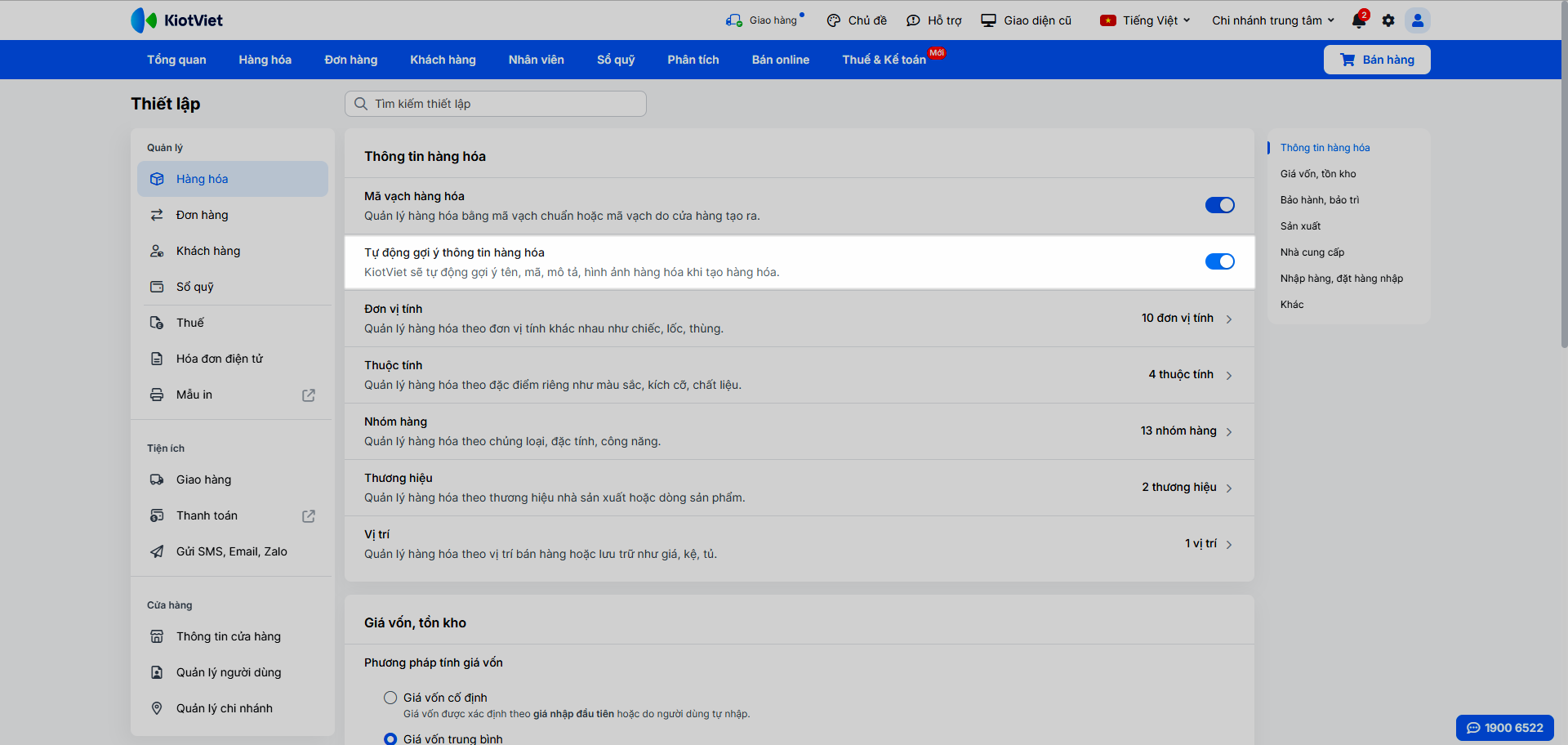 - Trên màn hình Thiết lập → Hàng hóa, bạn bật xanh tính năng Tự động gợi ý thông tin hàng hóa.