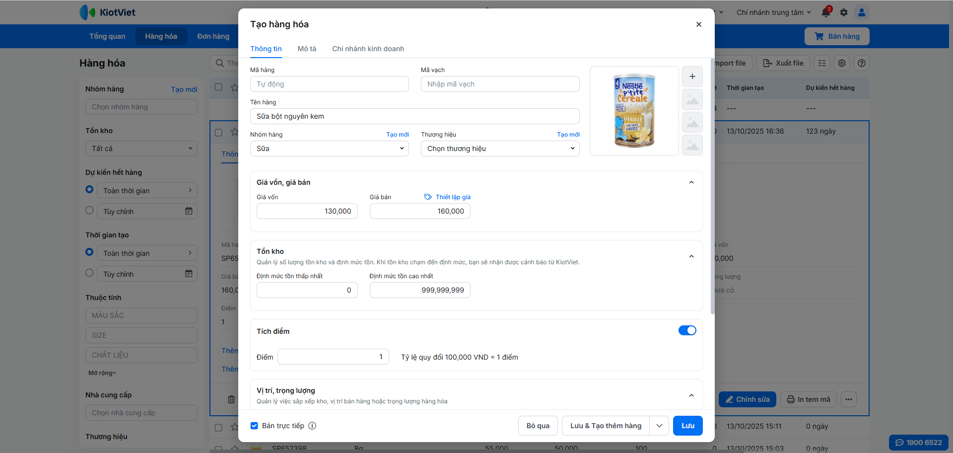 - Một cửa sổ thêm mới hàng hóa sẽ hiện ra với các thông tin đã được điền sẵn.