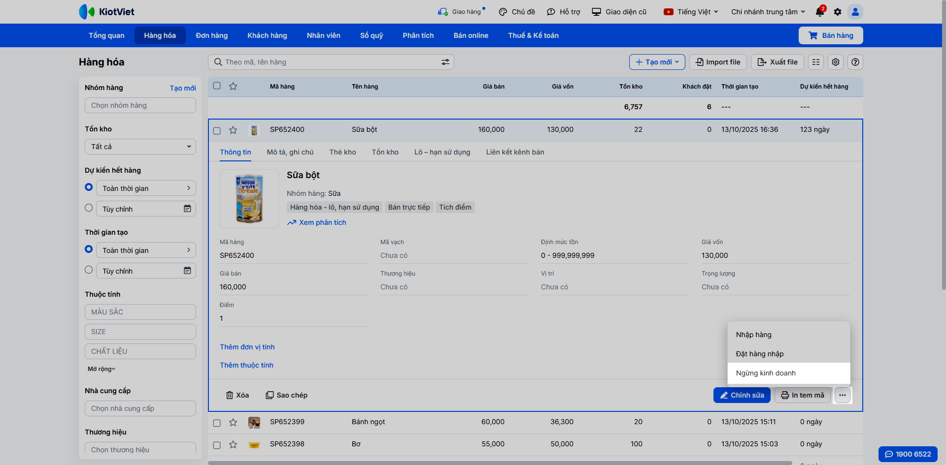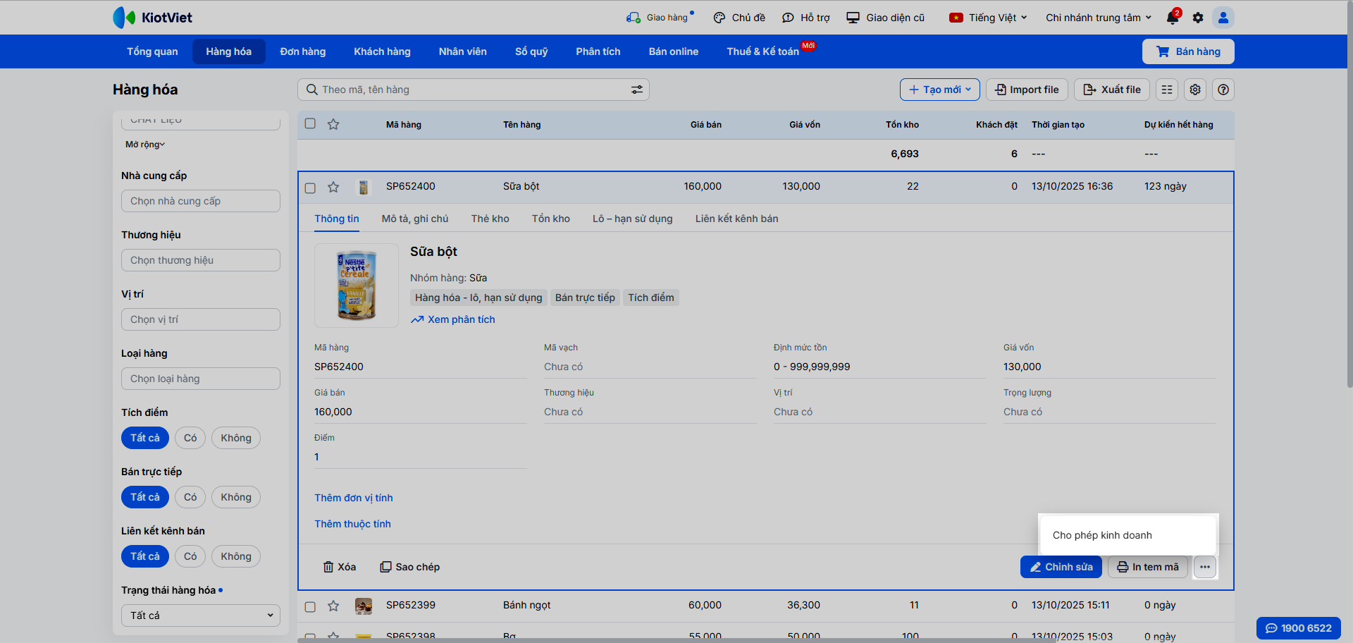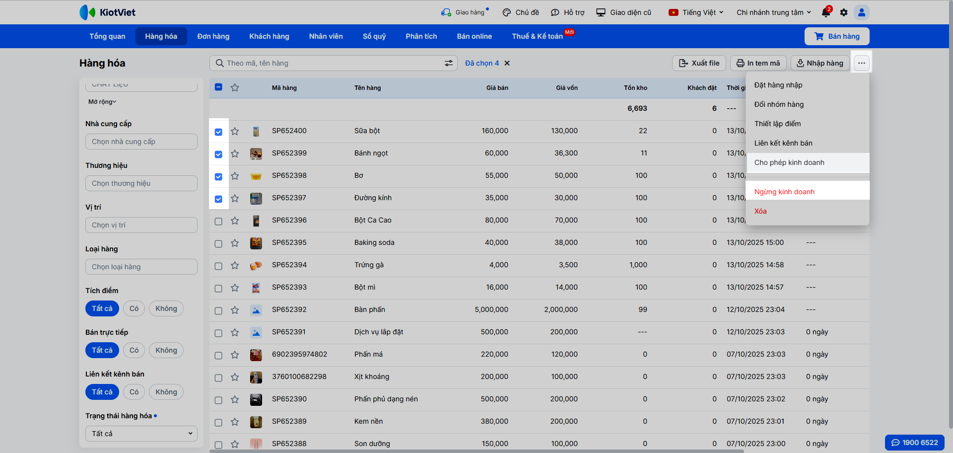 - Hệ thống cũng hỗ trợ ngừng/cho phép kinh doanh hàng loạt bằng cách tích chọn nhiều sản phẩm → nhấn 3 chấm → chọn thao tác tương ứng cần thực hiện.