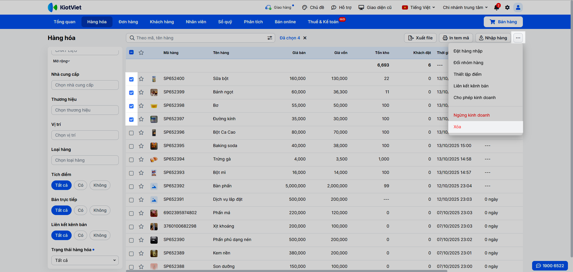 - Hệ thống cũng hỗ trợ xóa hàng loạt bằng cách tích chọn nhiều sản phẩm → nhấn 3 chấm → chọn Xóa