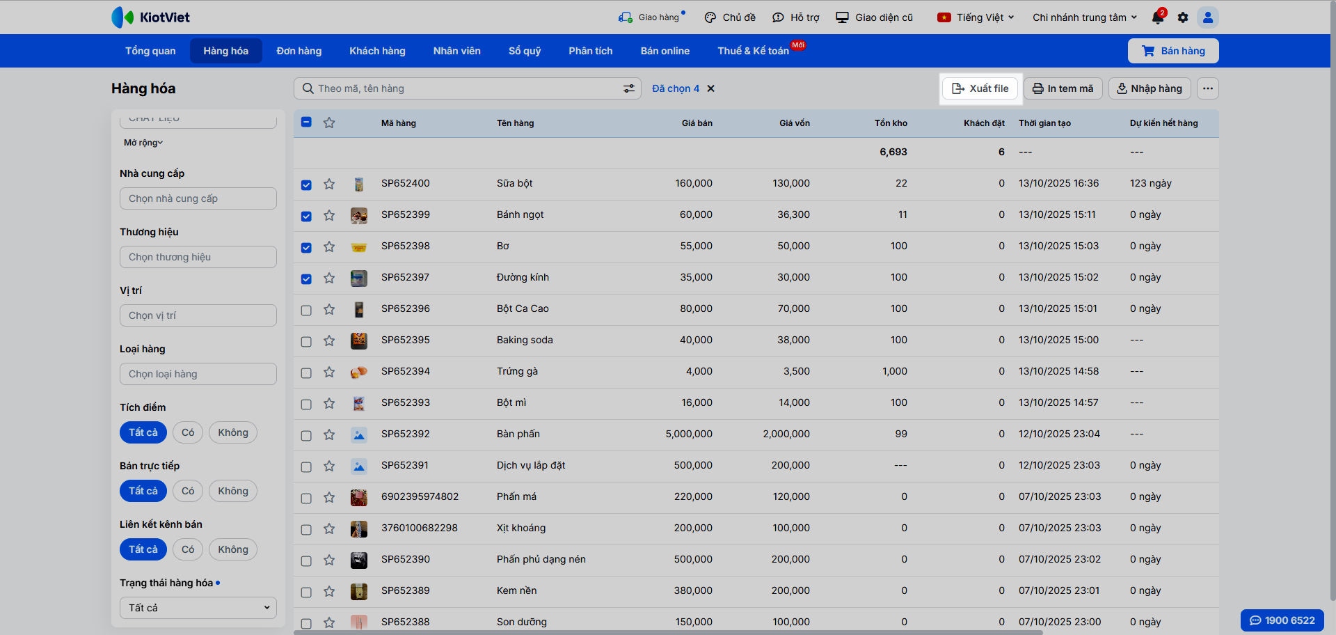 - Hoặc, tích chọn một số hàng hóa, nhấn Xuất file để chỉ tải về các sản phẩm đã chọn.