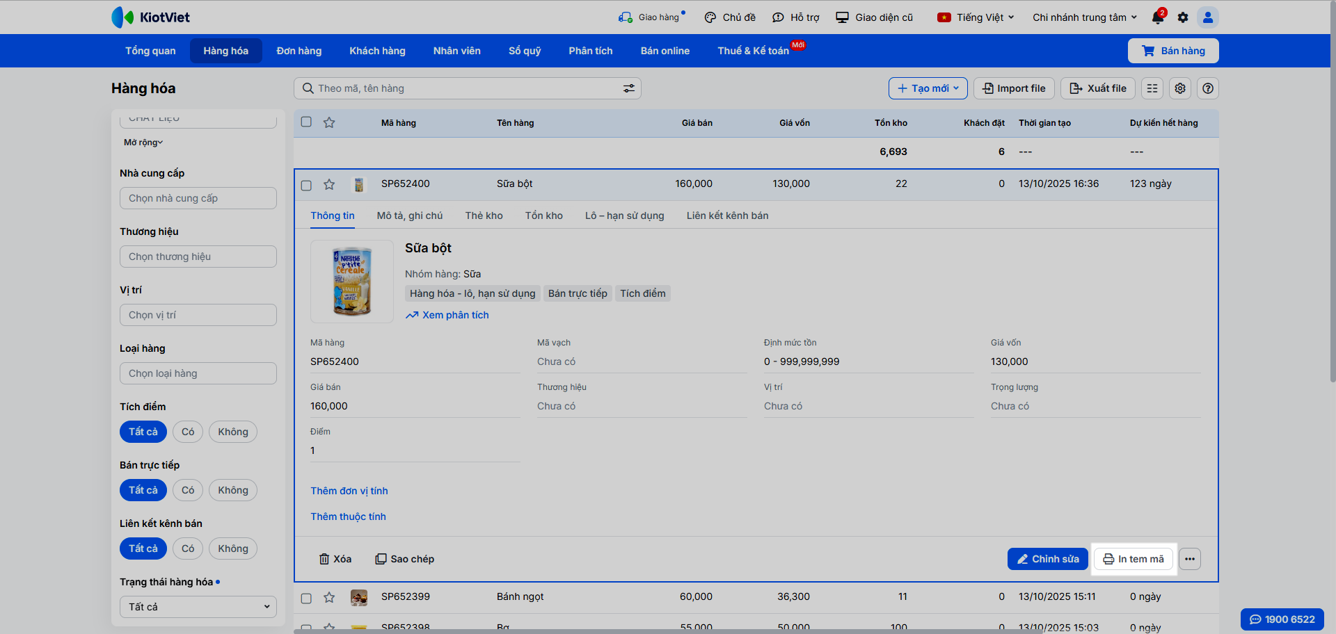 - Để in cho một sản phẩm: Tìm sản phẩm trong Danh sách hàng hóa và nhấn nút In tem mã.