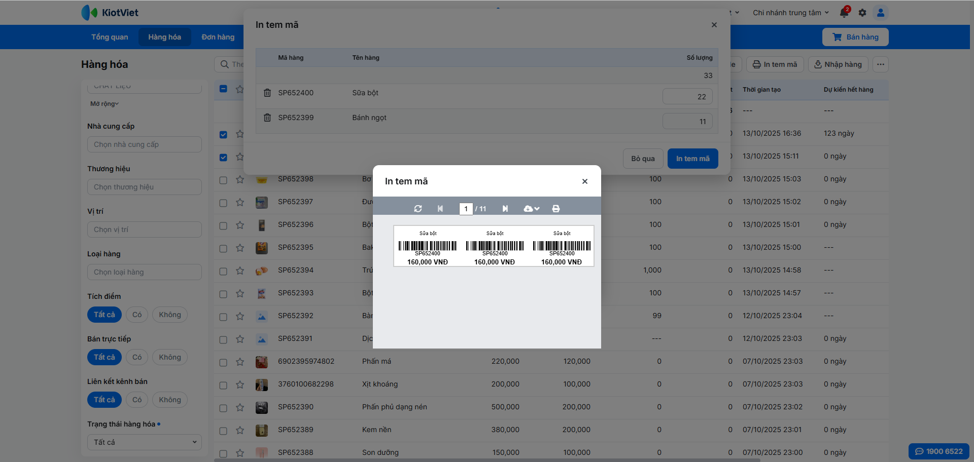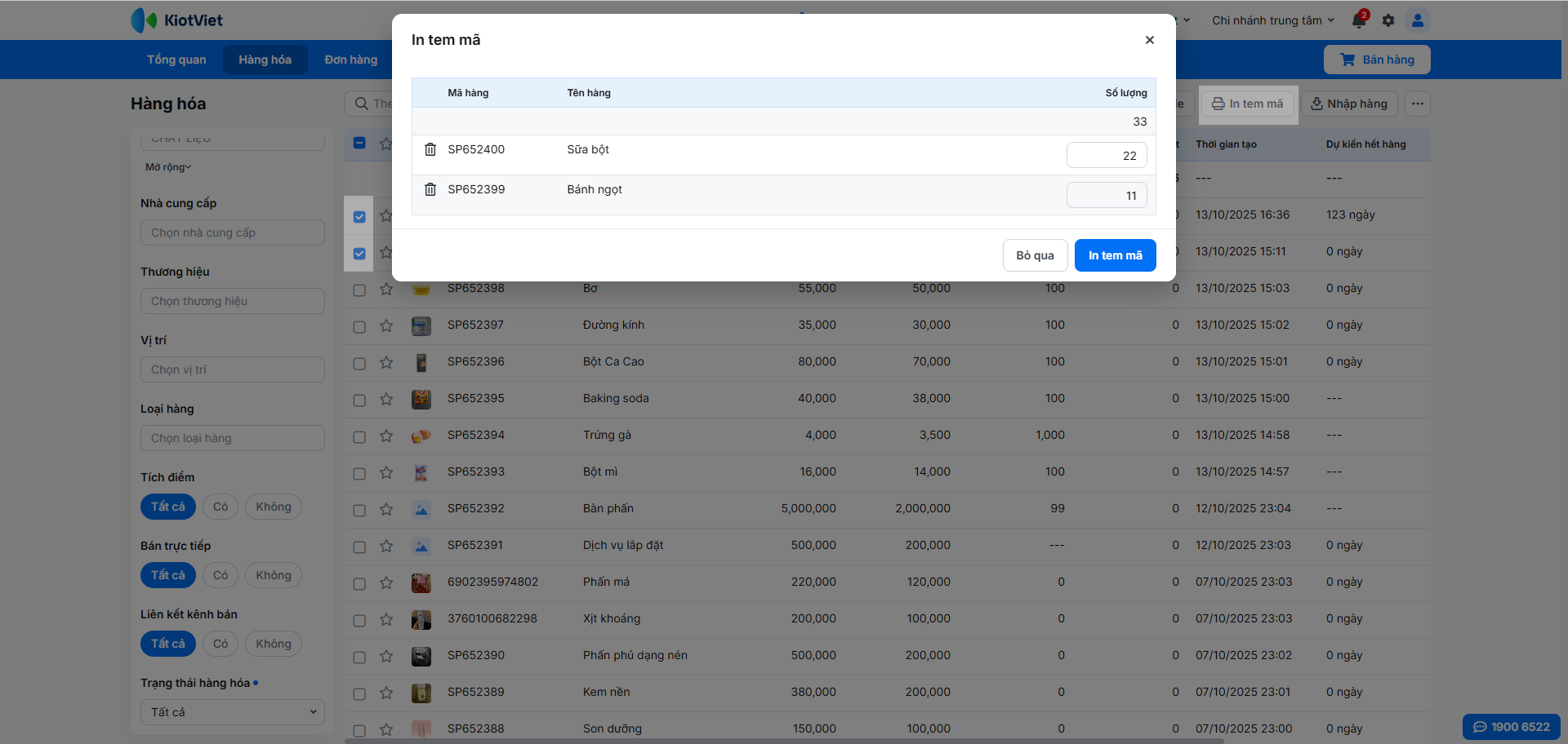 - Để in hàng loạt: Tích chọn các sản phẩm cần in → chọn In tem mã → nhập số lượng tem cần in (hệ thống mặc định theo số lượng tồn kho hiện tại của hàng hóa) → chọn In tem mã.