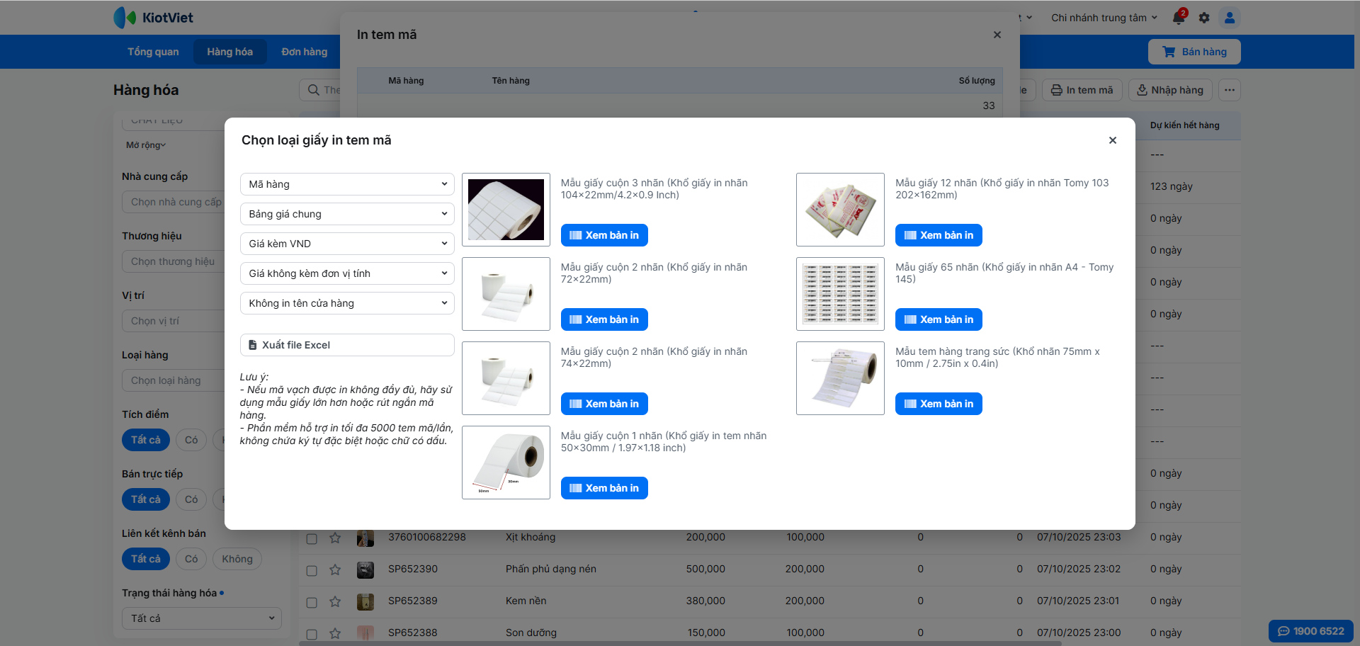 - Trong cửa sổ in, bạn tùy chỉnh các thông tin cần hiển thị trên tem (Mã hàng hay mã vạch, có in giá hay không, Giá có kèm VND hay không, Giá có kèm đơn vị tính hay không, có kèm tên cửa hàng hay không), chọn khổ giấy cần in → nhấn Xem bản in.
